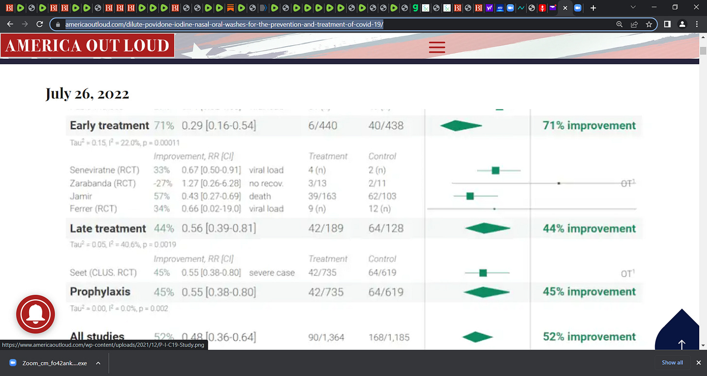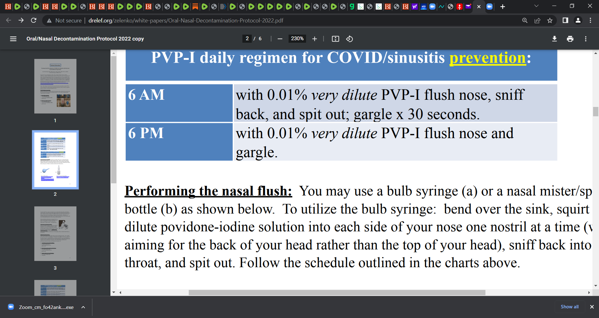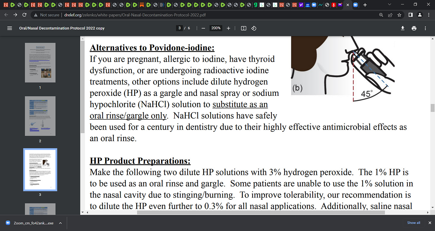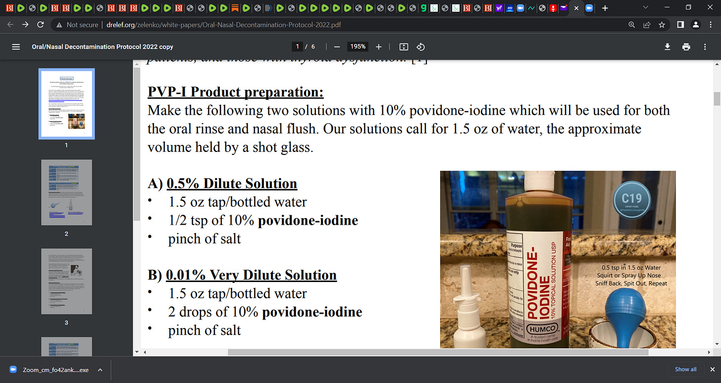 Povidone-Iodine Nasal/Oral Wash is near 100% effective in killing COVID virus in the nasal oral cavity and had we known of the nasal oral wash (we were clued into this by oral dental surgeons who came forward to explain what they do daily even before COVID emerged to mitigate pathogen exposure from patients), then we would not have needed early treatment. This nasal oral wash is that effective and you should use once you go outside and think you are exposed. Effective prevention and we recommend during this era of such elevated transmission risk from COVID BA.4 and BA.5 sub-variants/clades. Especially those who are COVID vaccinated, you are at tremendous risk for infection. Povidone-iodine or hydrogen peroxide or sodium hypochlorite, diluted as described, no swallow, swish and spit etc.