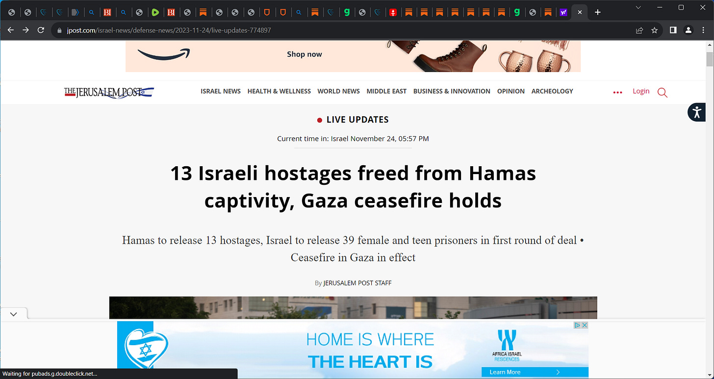 13 Israeli hostages freed from Hamas captivity, Gaza ceasefire holds; Hamas to release 13 hostages, Israel to release 39 female and teen prisoners in first round of deal • Ceasefire in Gaza in effect