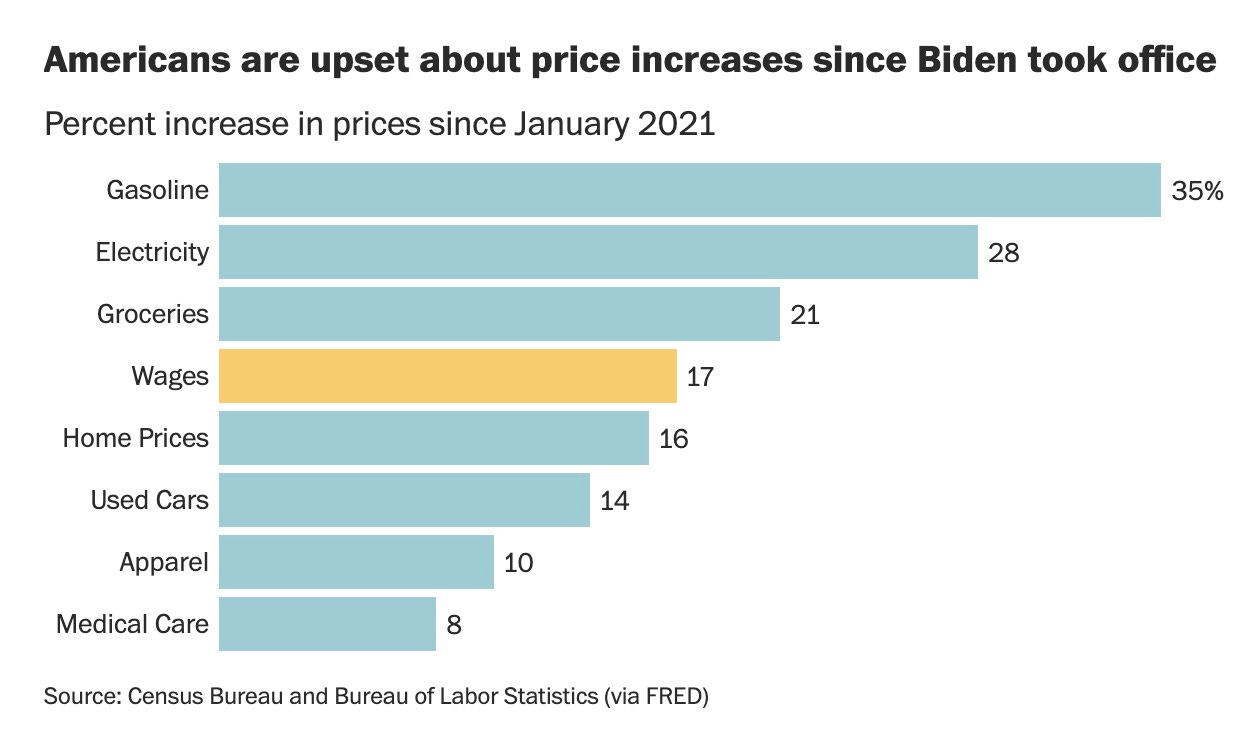 “Under the Biden-Harris administration, grocery prices have shot up 21%, part of an inflation surge that has raised overall costs by about 19% and soured many Americans on the economy, even as unemployment fell to historic lows. Wages have also risen sharply since the pandemic, and have outpaced prices for more than a year. Still, surveys find Americans continue to struggle with higher costs,” ABC wrote last week.