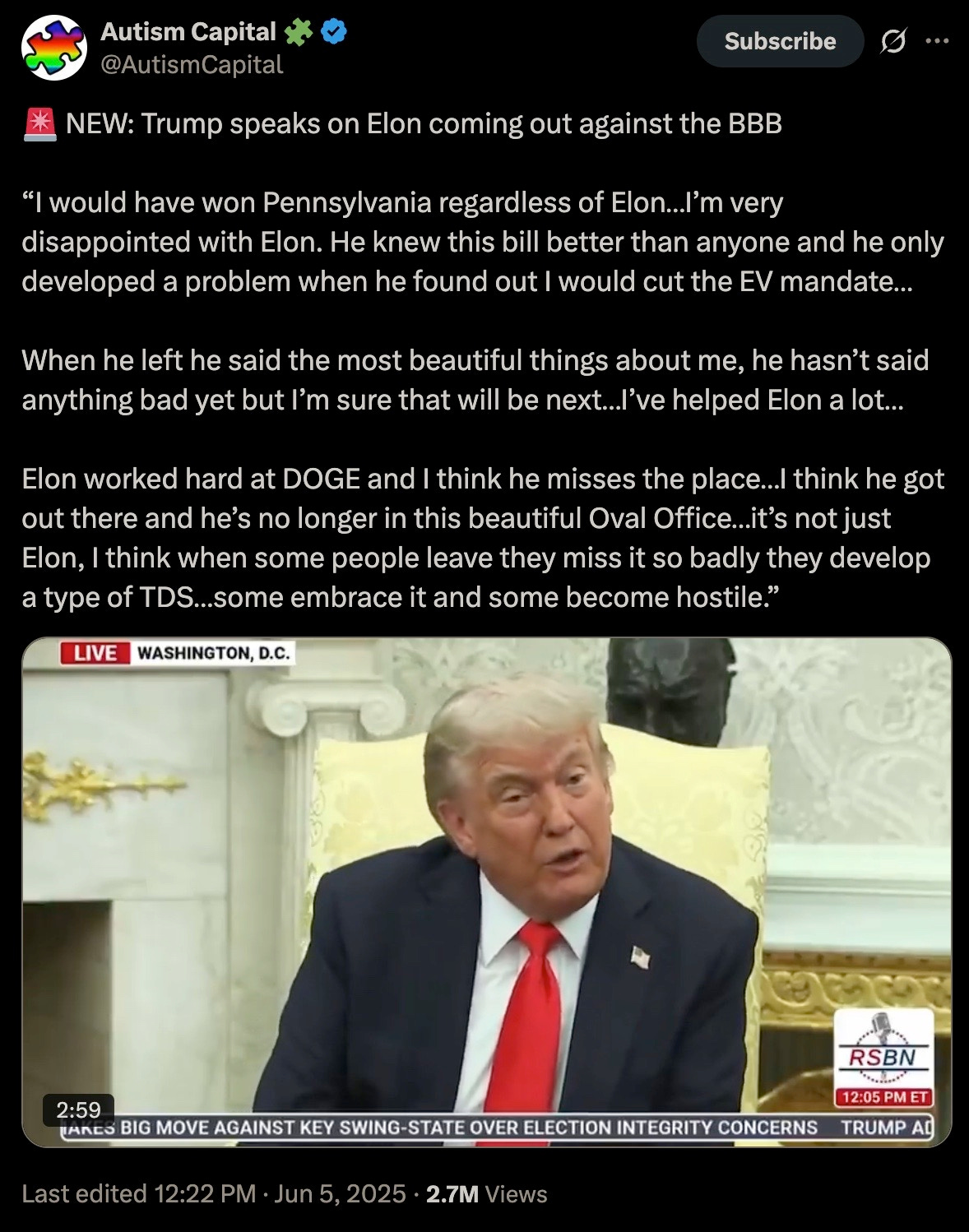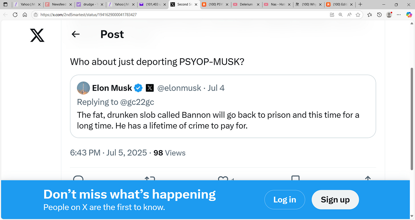 While PSYOP-MUSK is correct about the bill being disgusting — this is how psyops work; namely, there is much truth floated to then embed the disinfo tidbits for maximum social engineering and resultant chaos — PSYOP-MUSK escalated today’s spat on X: