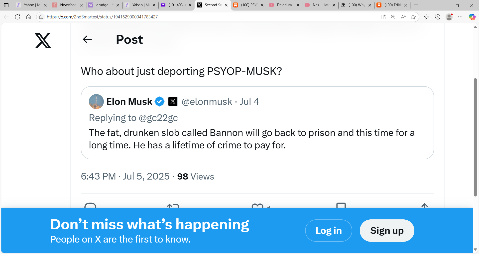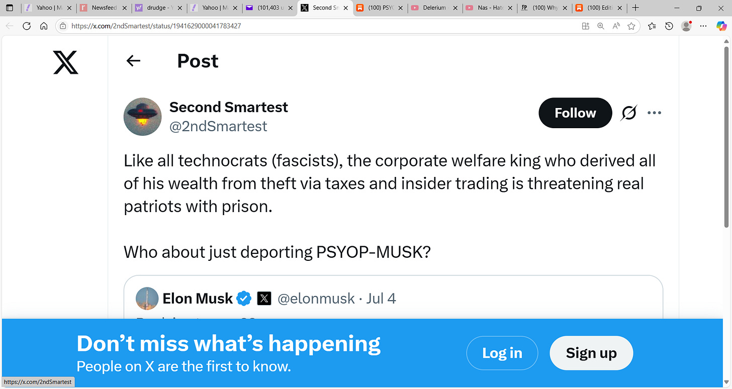 ‘Like all technocrats (fascists), the corporate welfare king who derived all of his wealth from theft via taxes and insider trading is threatening real patriots with prison. Who about just deporting PSYOP-MUSK?’