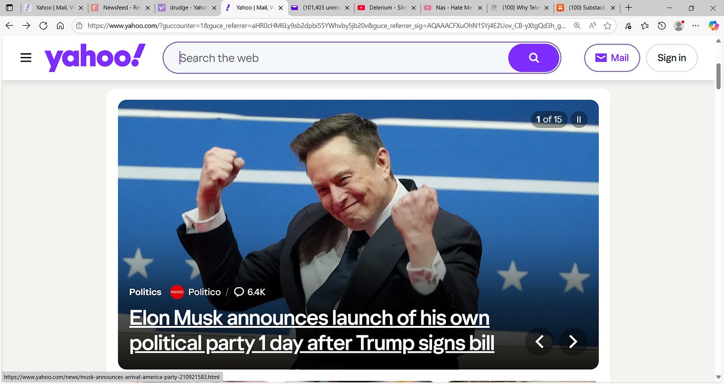 In passing, Trump called Musk's formation of the American Party "ridiculous". To Trump I would say that no one would even consider another political party if the existing parties would do the job expected of them. As we all know, the existing parties are criminal entities - a disgrace to America.