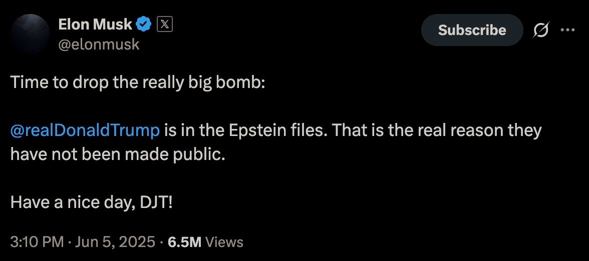 …we now arrive at what this Substack predicted years ago: the bromance between President Trump and his main MAGA squeeze looks to be finally over due to a disagreement over the mofugly ‘beautiful bill’ that is overflowing with, as per PSYOP-MUSK, “MOUNTAIN of DISGUSTING PORK;” to wit: