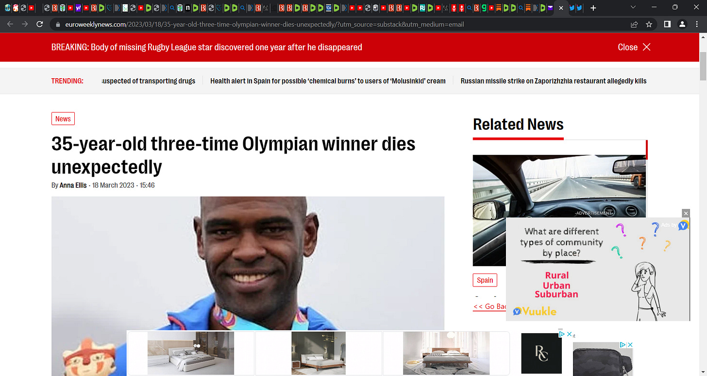 A 35 yr old sports figure dying suddenly would have been shocking news prior to 2021. Magnificently fit athletes in the prime of life die suddenly if they are in a car accident, shot by a gun, drown, drug overdose, plane crash, etc. PEOPLE LIKE THAT DON'T JUST FALL OVER DEAD FOR NO REASON. Our media and our medical establishments have failed us. They should be reporting on this with the same vigor and desire to find the truth as Dr. Alexander and his heroic colleagues. That they aren't while massive injuries and deaths take place makes it difficult not to conclude that it is intentional.