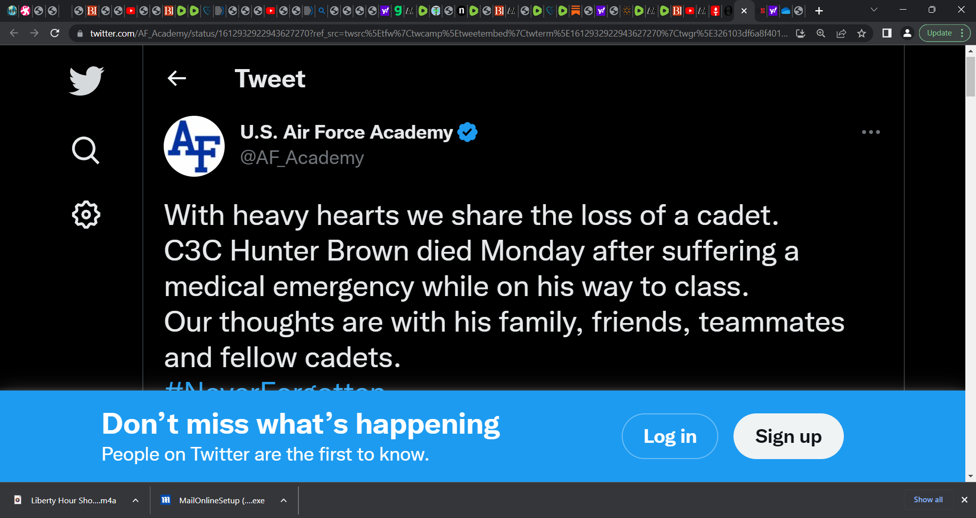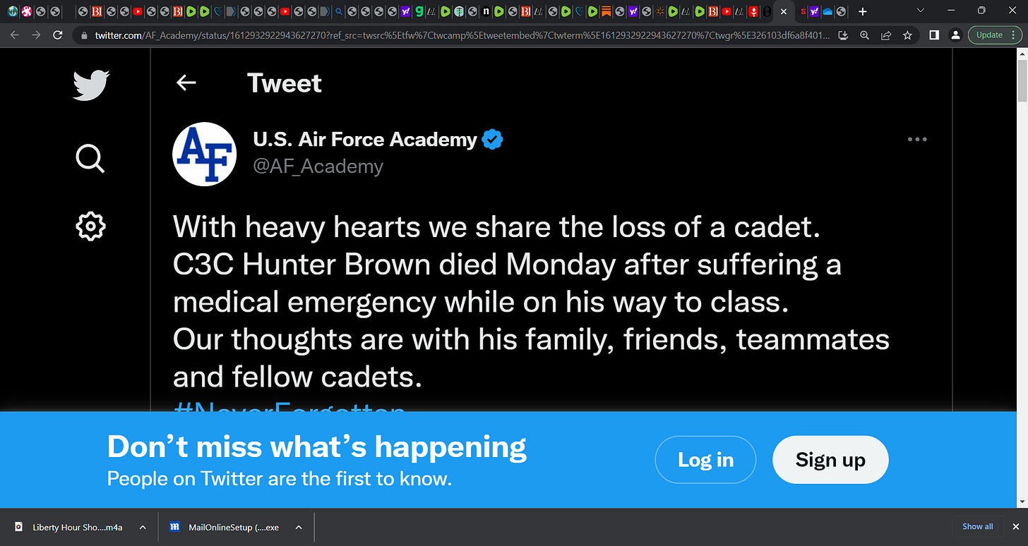 What about 21 year old Air Force football player Hunter Brown, who suffered a "medical emergency" while walking to class and passed away?