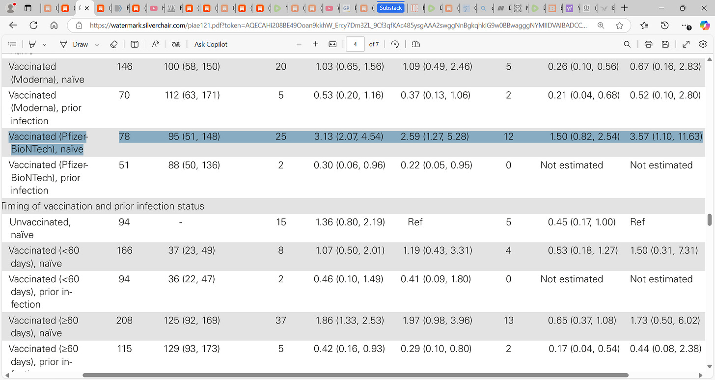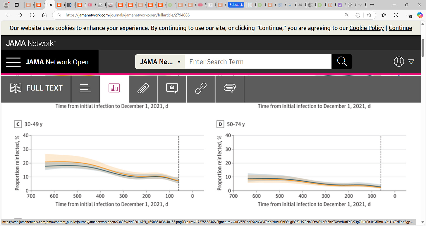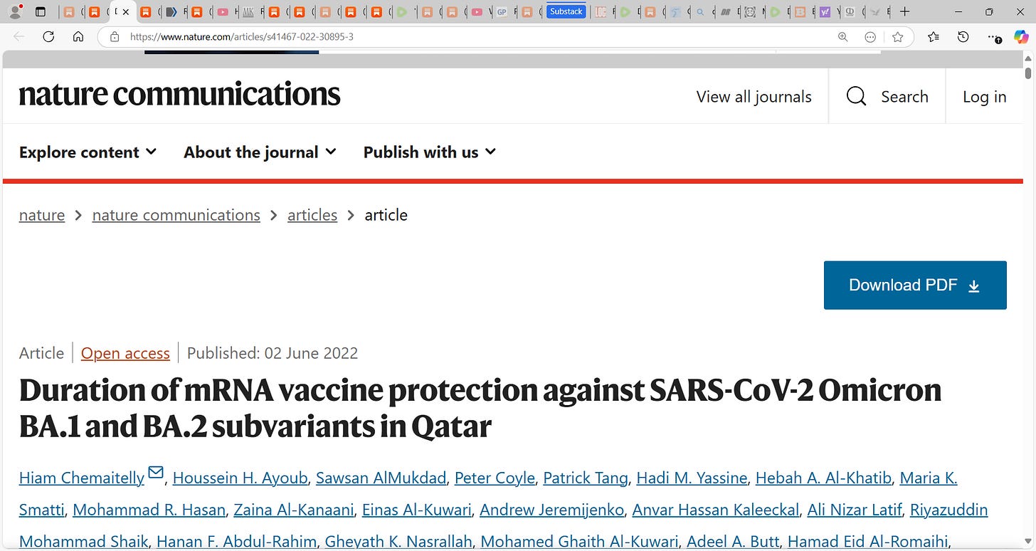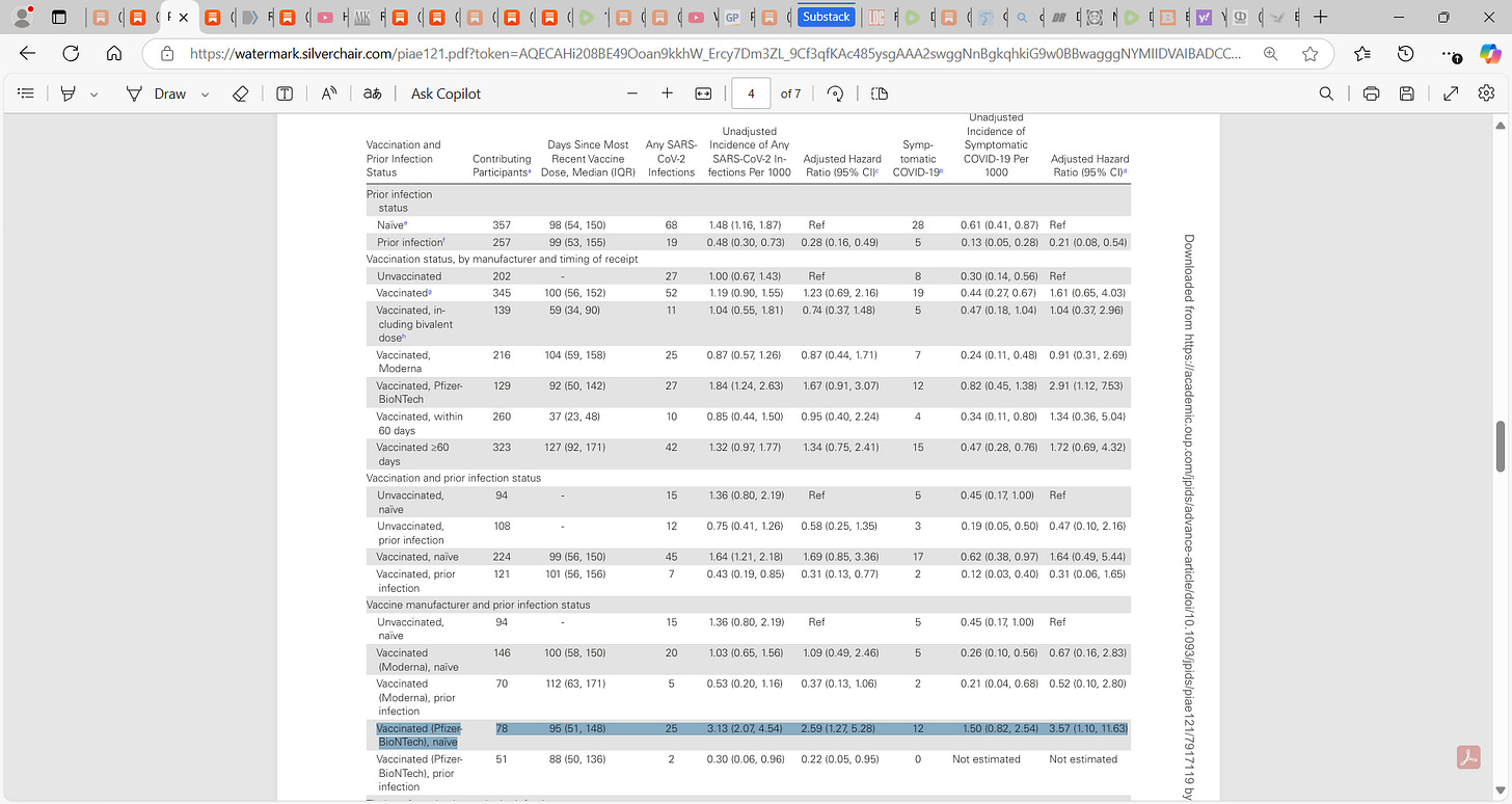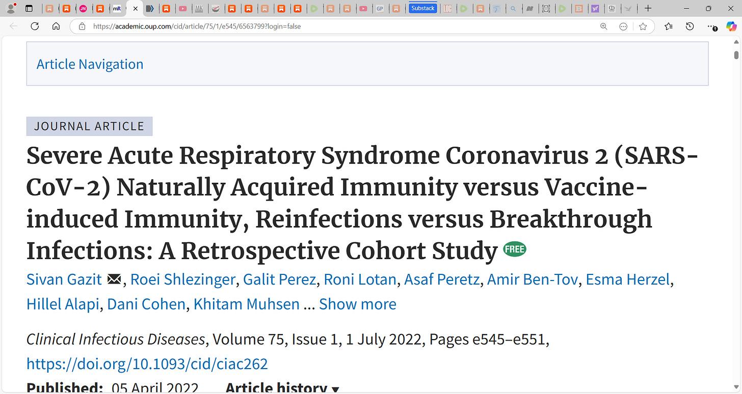 52) Protection and Waning of Natural and Hybrid Immunity to SARS-CoV-2“The number of cases of SARS-CoV-2 infection per 100,000 person-days at risk (adjusted rate) increased with the time that had elapsed since vaccination with BNT162b2 or since previous infection. Among unvaccinated persons who had recovered from infection, this rate increased from 10.5 among those who had been infected 4 to less than 6 months previously to 30.2 among those who had been infected 1 year or more previously. Among persons who had received a single dose of vaccine after previous infection, the adjusted rate was low (3.7) among those who had been vaccinated less than 2 months previously but increased to 11.6 among those who had been vaccinated at least 6 months previously. Among previously uninfected persons who had received two doses of vaccine, the adjusted rate increased from 21.1 among those who had been vaccinated less than 2 months previously to 88.9 among those who had been vaccinated at least 6 months previously.