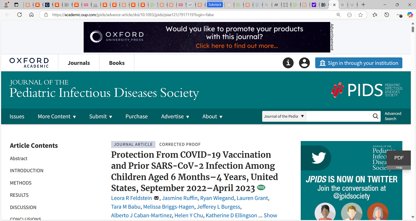 71)Feldstein et al. (Protection From COVID-19 Vaccination and Prior SARS-CoV-2 Infection Among Children Aged 6 Months–4 Years, United States, September 2022–April 2023): sought to ‘understand how coronavirus disease 2019 vaccines impact infection risk in children <5 years’, so researchers ‘assessed risk of severe acute respiratory syndrome coronavirus 2 (SARS-CoV-2) infection from September 2022 to April 2023 in 3 cohort studies.’ Researchers reported “There was no difference in risk by vaccination status…they may not reduce SARS-CoV-2 infections in young children.”