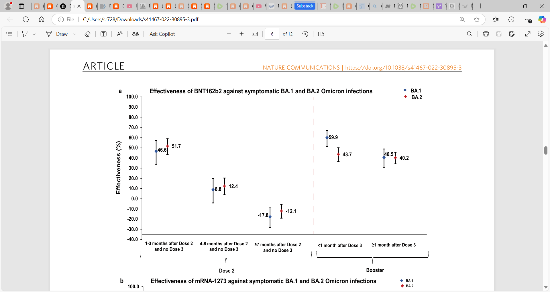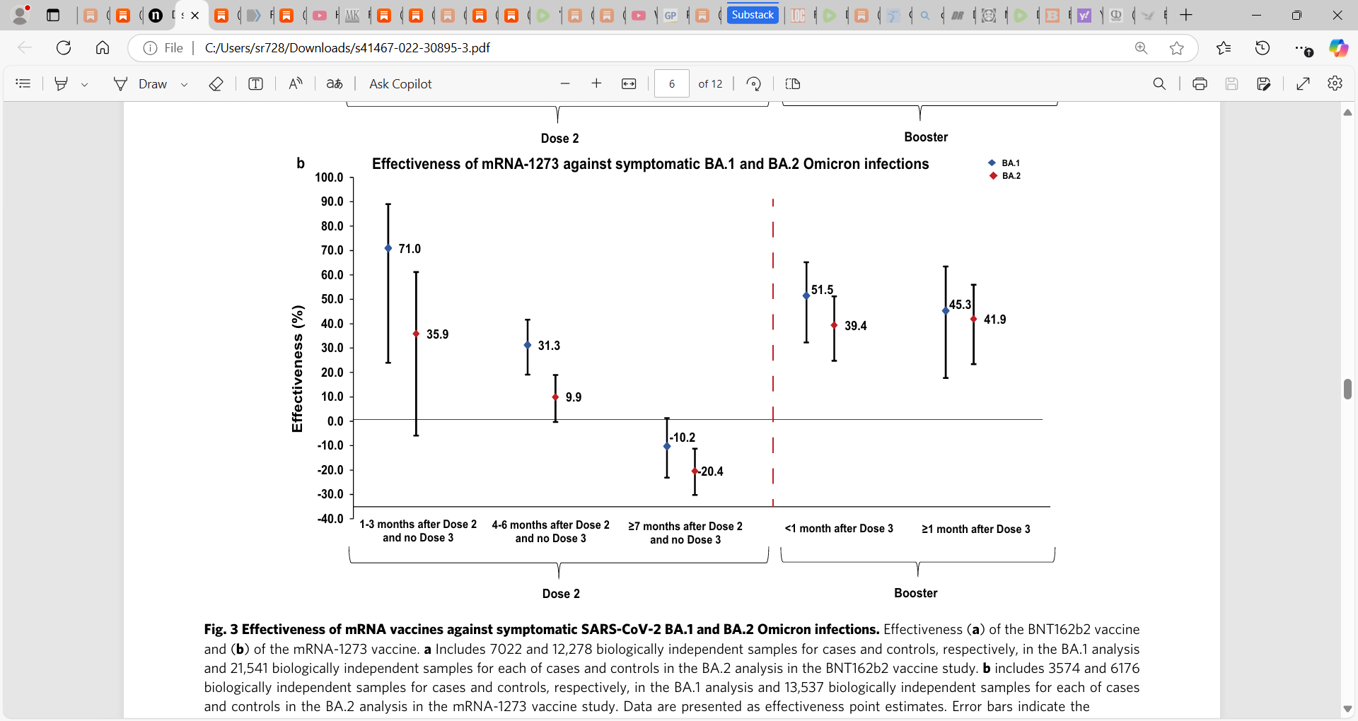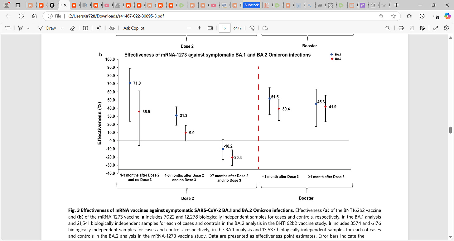 4) Chemaitelly et al. (Duration of mRNA vaccine protection against SARS-CoV-2 Omicron BA.1 and BA.2 subvariants in Qatar): ‘a matched, test-negative, case-control study to estimate duration of protection of the second and third/booster doses of mRNA COVID-19 vaccines against BA.1 and BA.2 infections in Qatar. BNT162b2 effectiveness was highest at 46.6% (95% CI: 33.4–57.2%) against symptomatic BA.1 and at 51.7% (95% CI: 43.2–58.9%) against symptomatic BA.2 infections in the first three months after the second dose, but declined to ~10% or below thereafter. Effectiveness rebounded to 59.9% (95% CI: 51.2–67.0%) and 43.7% (95% CI: 36.5–50.0%), respectively, in the first month after the booster dose, before declining again.’