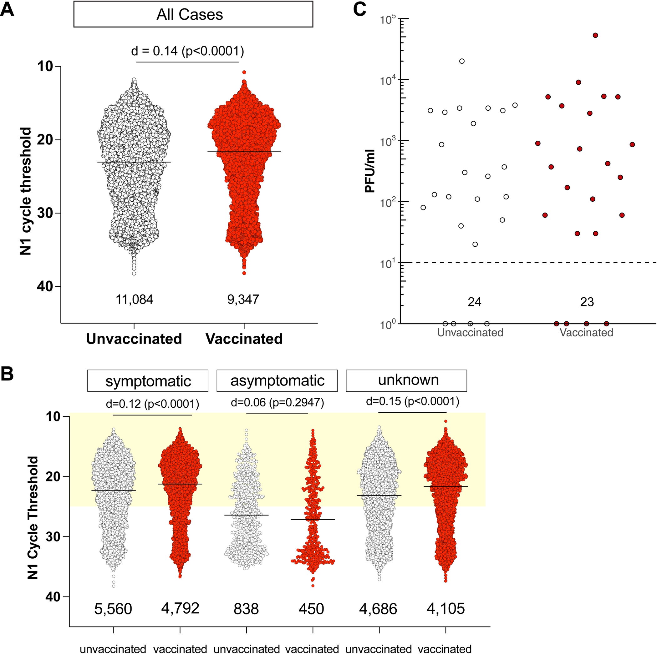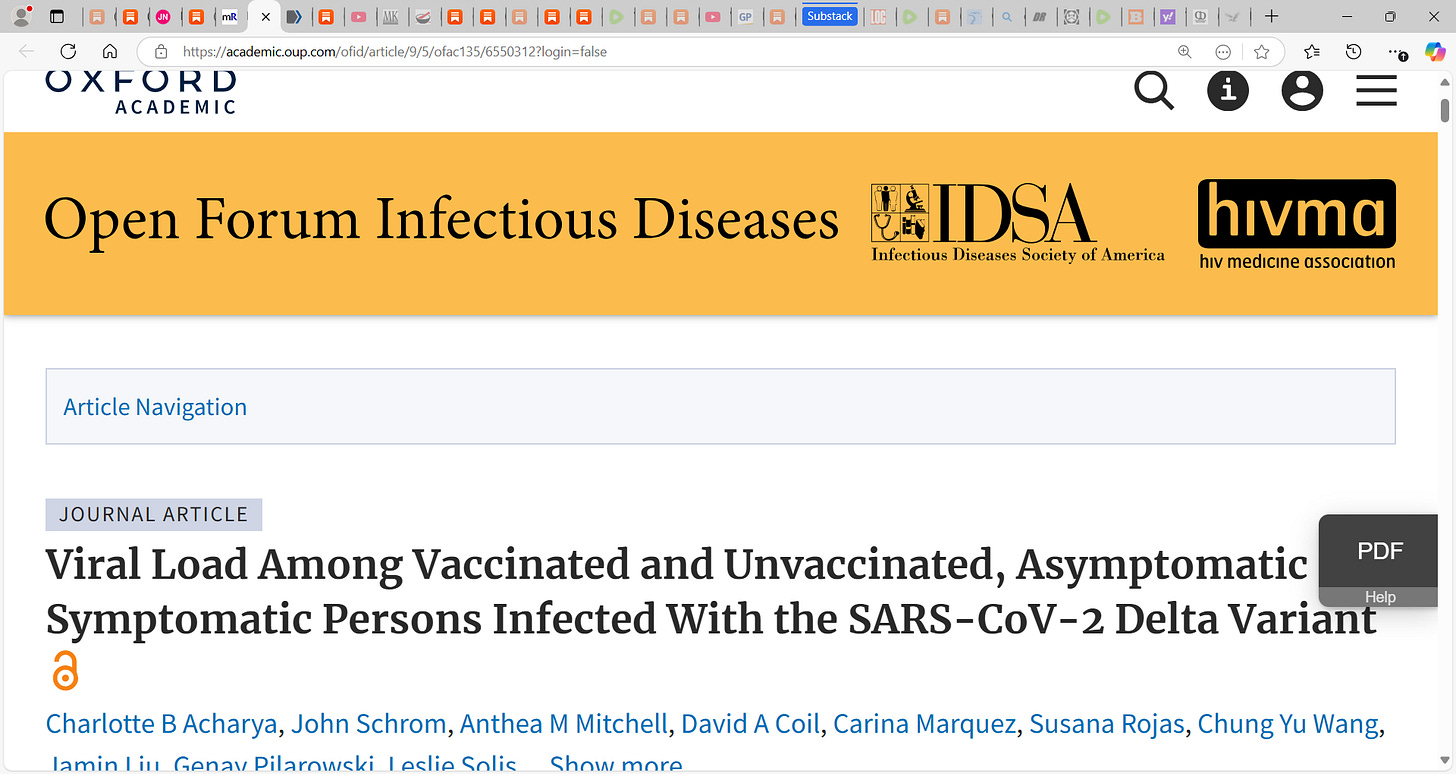 2) Acharya et al. (Viral Load Among Vaccinated and Unvaccinated, Asymptomatic and Symptomatic Persons Infected With the SARS-CoV-2 Delta Variant); Ignoring the risk of infection, given that someone was infected, Acharya et al. found “no significant difference in cycle threshold values between vaccinated and unvaccinated, asymptomatic and symptomatic groups infected with SARS-CoV-2 Delta.”