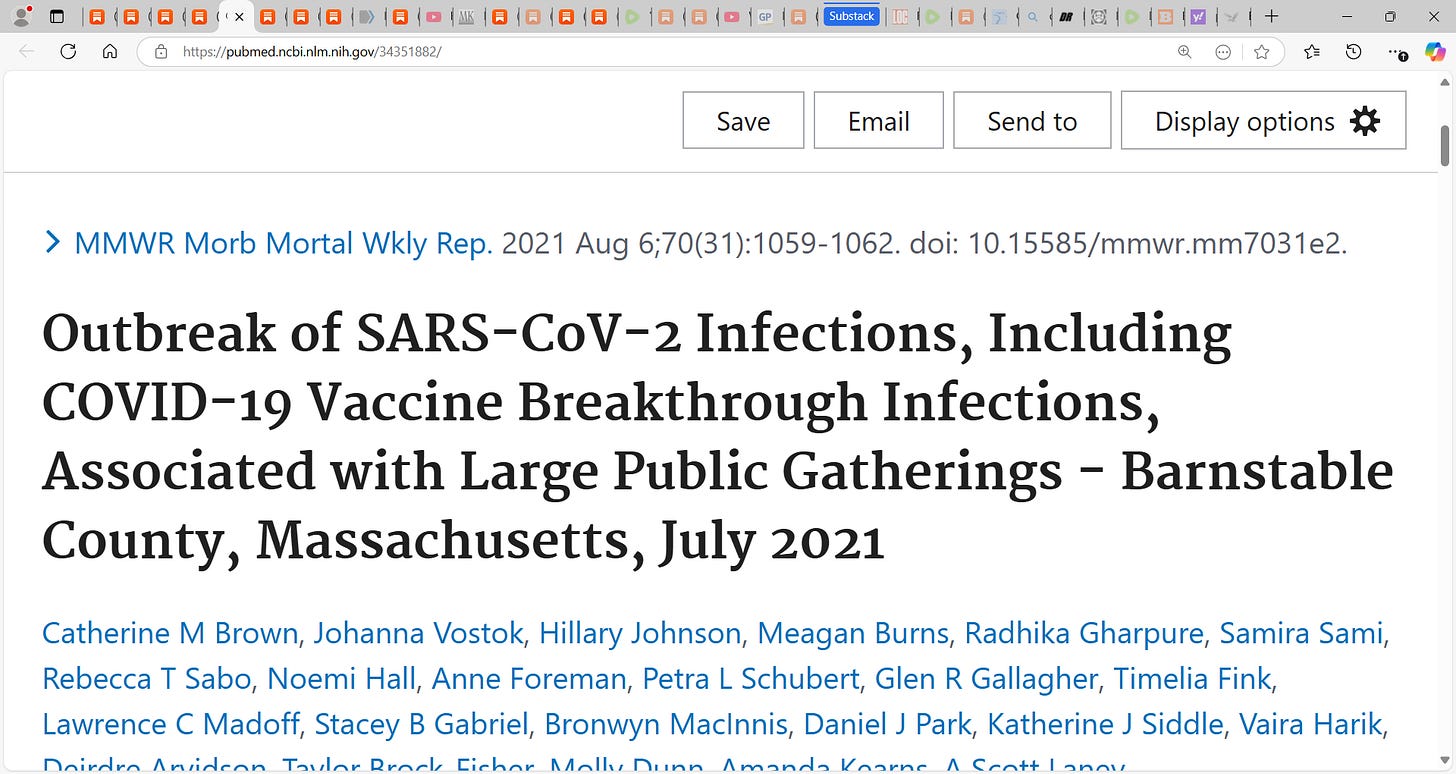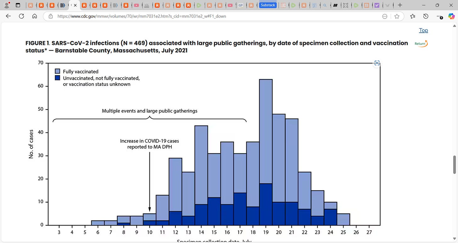8) Brown et al. (Outbreak of SARS-CoV-2 Infections, Including COVID-19 Vaccine Breakthrough Infections, Associated with Large Public Gatherings - Barnstable County, Massachusetts, July 2021); In Barnstable, Massachusetts, Brown et al. found that among 469 cases of COVID-19, 74% were fully vaccinated, and that “the vaccinated had on average more virus in their nose than the unvaccinated who were infected.”