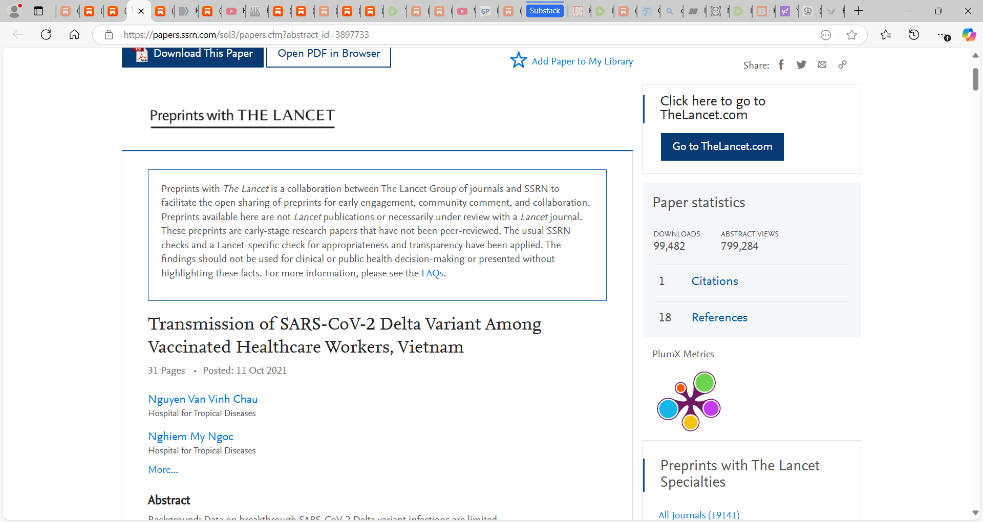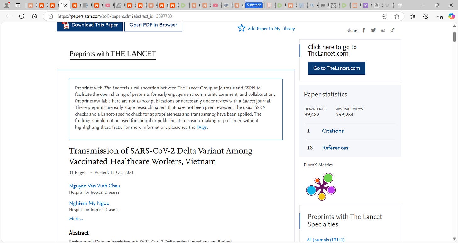 7) Chau et al. (Transmission of SARS-CoV-2 Delta Variant Among Vaccinated Healthcare Workers, Vietnam); looked at transmission of SARS-CoV-2 Delta variant among vaccinated healthcare workers in Vietnams. Of 69 healthcare workers that tested positive for SARS-CoV-2, 62 participated in the clinical study, all of whom recovered. For 23 of them, complete-genome sequences were obtained, and all belonged to the Delta variant. “Viral loads of breakthrough Delta variant infection cases were 251 times higher than those of cases infected with old strains detected between March-April 2020”. “Breakthrough Delta variant infections are associated with high viral loads, prolonged PCR positivity, and low levels of vaccine-induced neutralizing antibodies, explaining the transmission between the vaccinated people.”