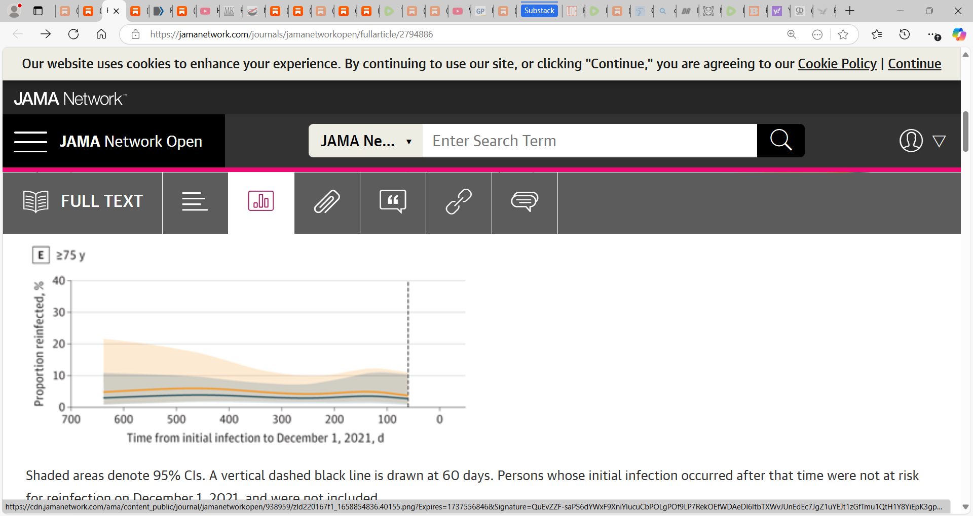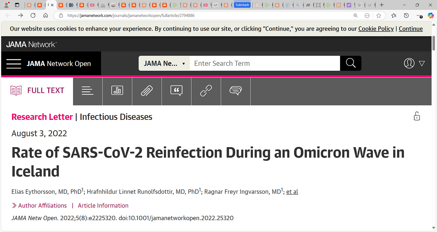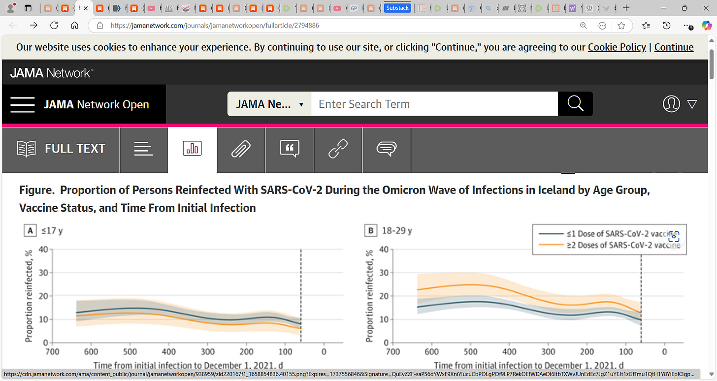 58) Eythorsson, 2022: Rate of SARS-CoV-2 Reinfection During an Omicron Wave in Iceland: “11 536 PCR-positive persons were included. The mean (SD) age was 34 (19) years (median, 31 years; range, 0-102 years), 5888 (51%) were male, 2942 (25.5%) had received at least 1 dose of vaccine, and the mean (SD) time from initial infection was 287 (191) days (median, 227 days; range, 60-642 days); The probability of reinfection increased with time from the initial infection (odds ratio of 18 months vs 3 months, 1.56; 95% CI, 1.18-2.08) (Figure) and was higher among persons who had received 2 or more doses compared with 1 dose or less of vaccine (odds ratio, 1.42; 95% CI, 1.13-1.78)” “2 or more doses of vaccine were associated with a slightly higher probability of reinfection compared with 1 dose or less.”
