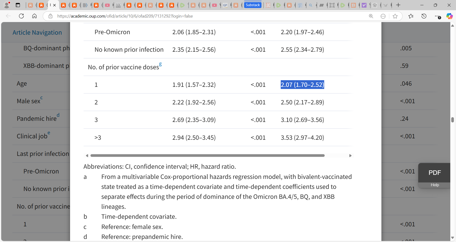 3 doses= adjusted HR 3.10 (95% CI 2.69-3.56) or a 210% increase chance of infection relative to no dose
