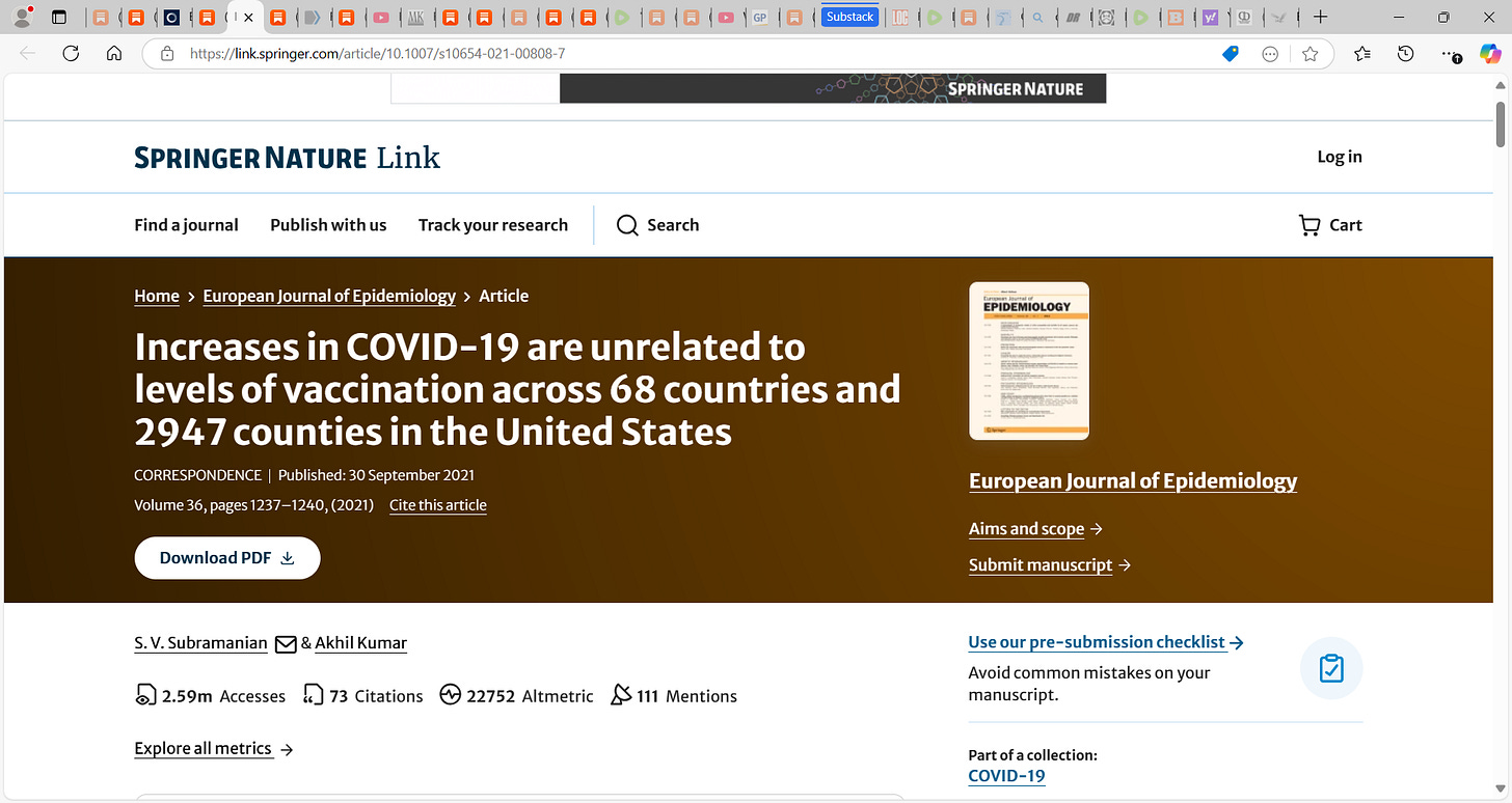 5) Subramanian (Increases in COVID-19 are unrelated to levels of vaccination across 68 countries and 2947 counties in the United States): Subramanian reported that “at the country-level, there appears to be no discernable relationship between percentage of population fully vaccinated and new COVID-19 cases.” When comparing 2947 counties in the United States, there were slightly less cases in more vaccinated locations. In other words, there is no clear discernable relationship. “In fact, the trend line suggests a marginally positive association such that countries with higher percentage of population fully vaccinated have higher COVID-19 cases per 1 million people.”