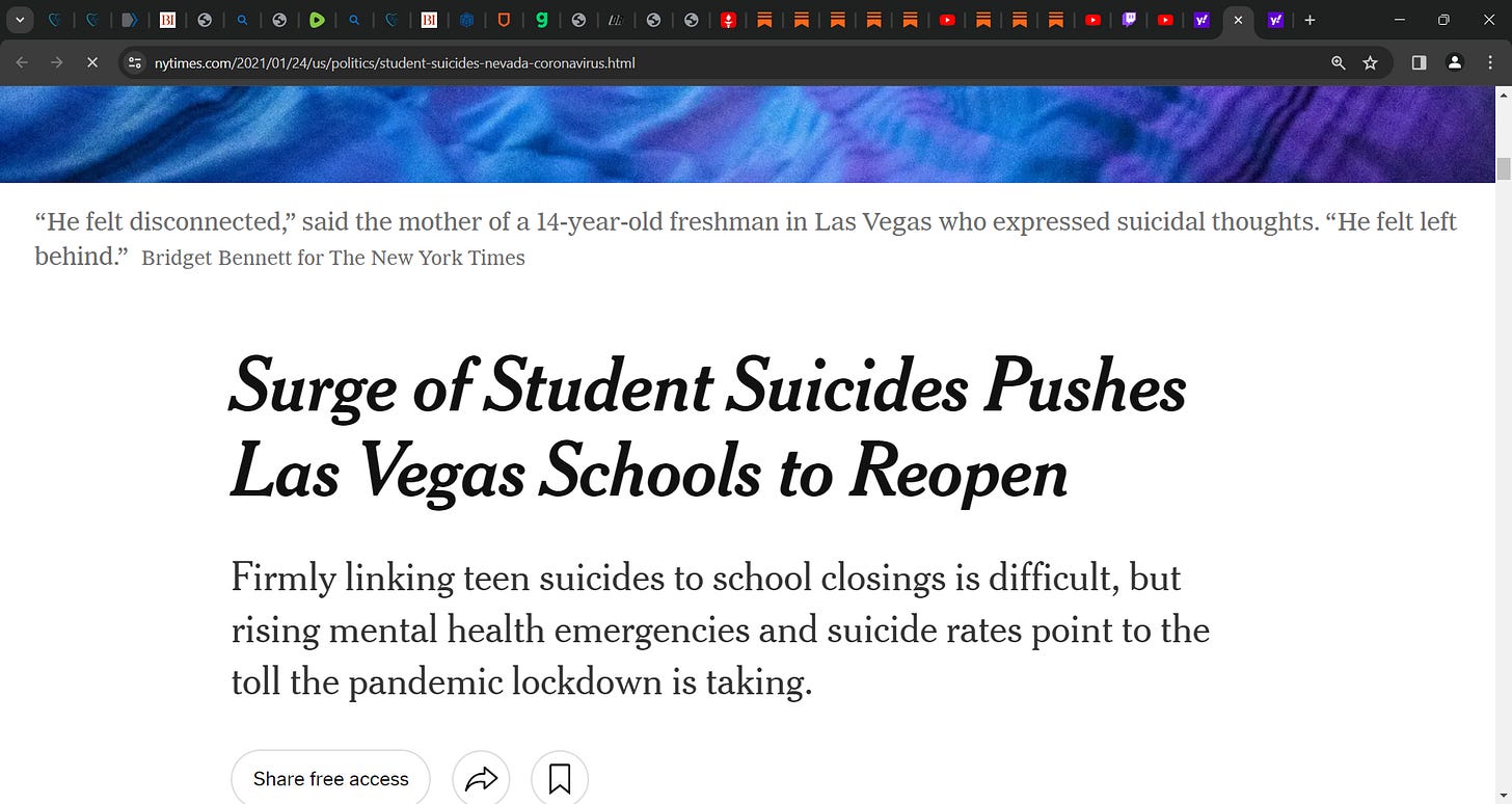 For NY Times to report this 9 months out, you know it was true and the press refused to cover this as to how many American children hung themselves due to the lockdowns and school closures as I was in DC and the word was the legacy media decided DO NOT cover it as Trump would get credit, as he was banging at CDC and the corrupted insane Teacher Union President to open schools…he knew children were hanging themselves…how, we told him, data was coming to us from states…thats why he was fighting Fauci on stage to open economy and schools…Fauci and Birx have blood on their hands…