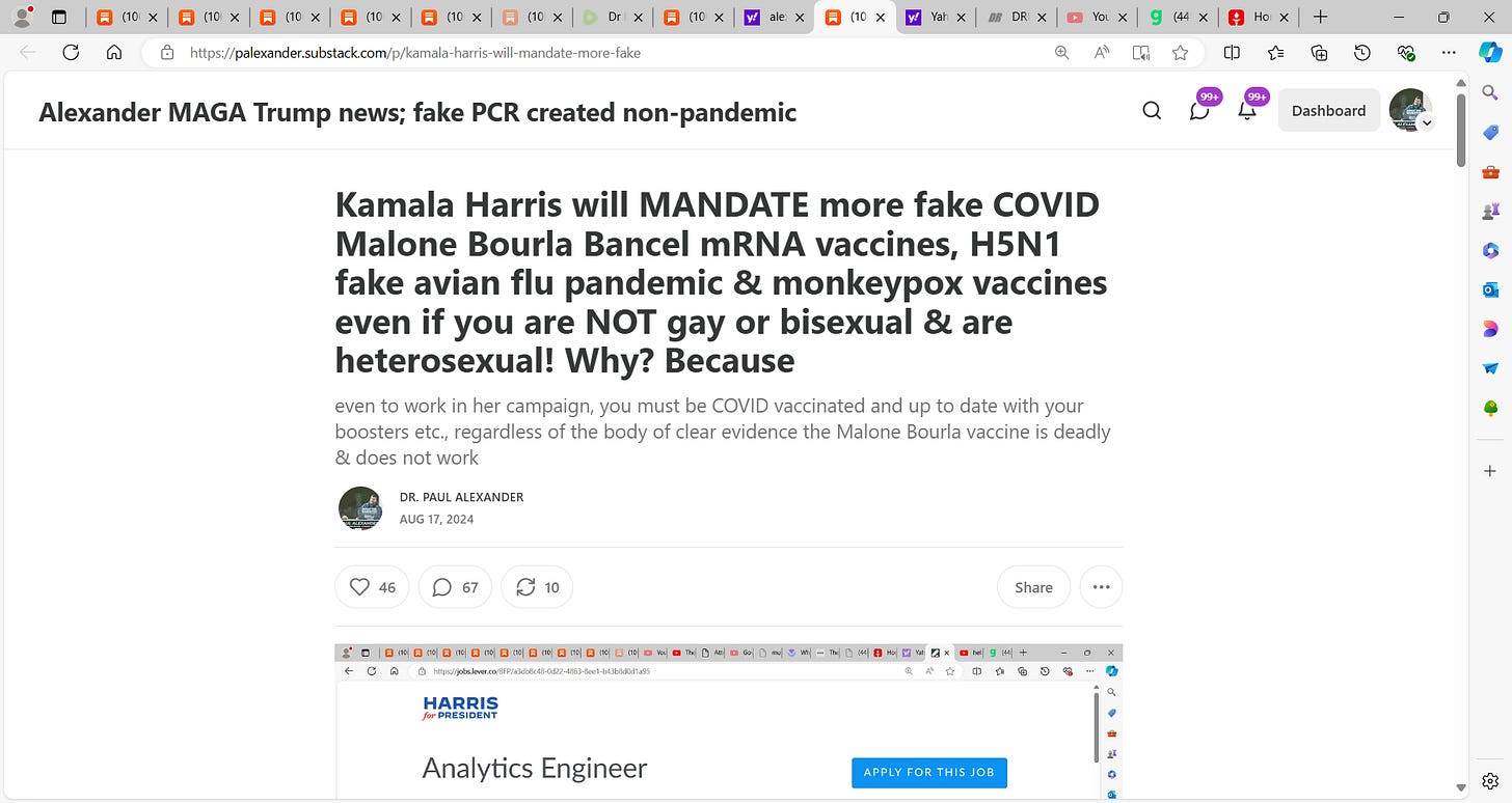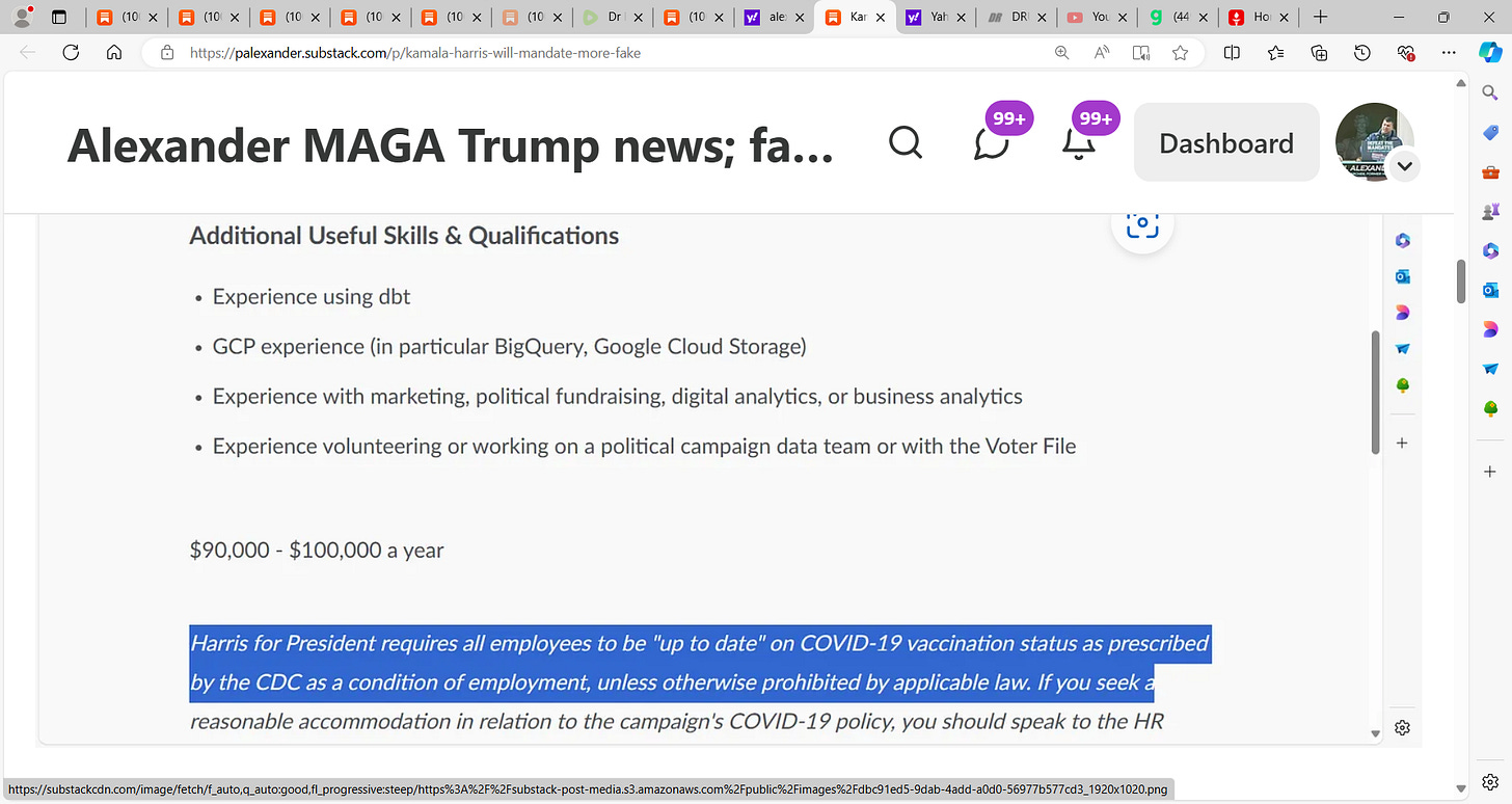 So, understand where a POTUS Harris will take us with vaccine mandates etc. and beyond the insane places we have already been taken. Most of you here will not apply to work in the Harris campaign for you are NOT vaccinated with the fraud COVID shot. You were critical thinkers and did not fall for the lies. I checked, the Trump campaign DOES NOT require you to be COVID vaccinated etc.