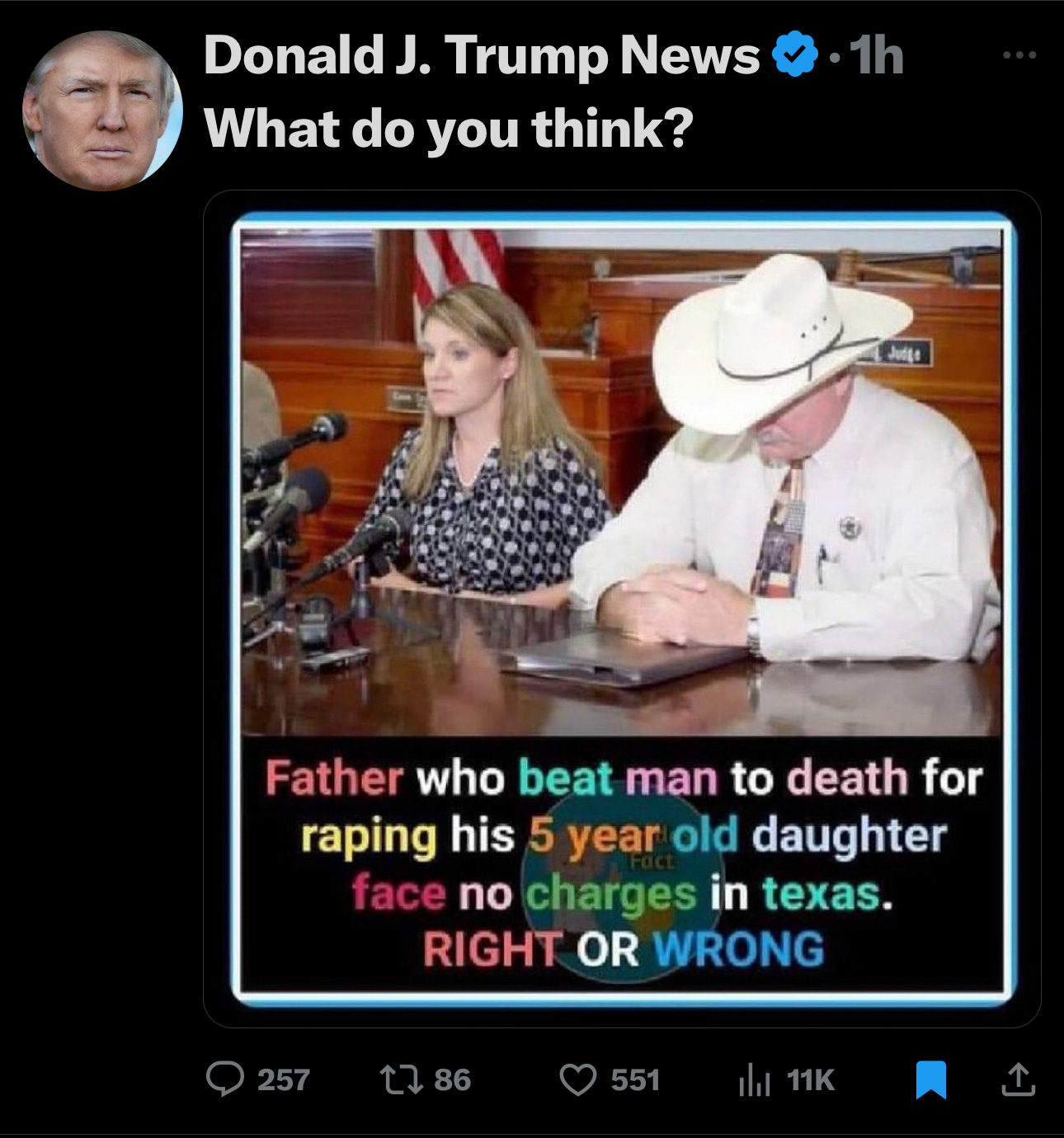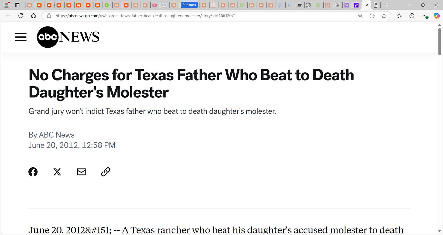 I like this outcome, having no mercy on the feral animal! Texas court say NO charges! I agree & Trump asks if you agree? He is being sarcastic! He would have done same if it was his child! I would
