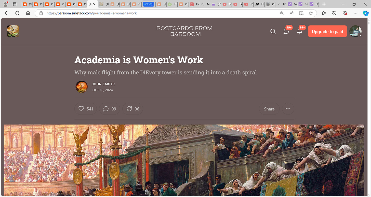 'Academia is Women’s Work; Why male flight from the DIEvory tower is sending it into a death spiral'...very exceptional writing AGAIN by John Carter, "Back in the nineties, when guys still thought