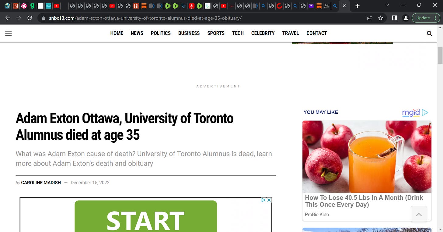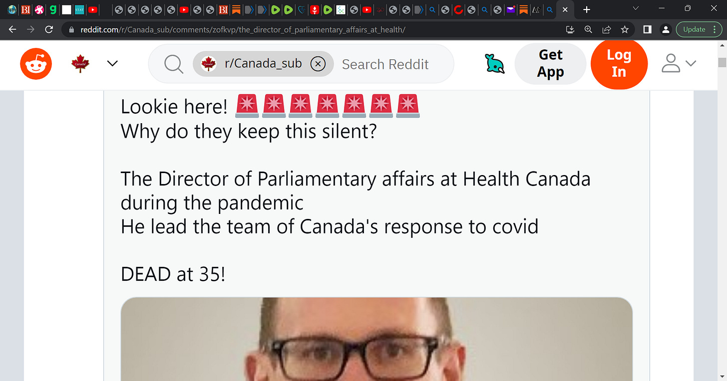 Adam Exton who was one in leadership at Health Canada (Director of affairs Health Canada) as part of pandemic response for Canada, DEAD at 35! Was it the fraud COVID gene injection 'vaccine' therapy?