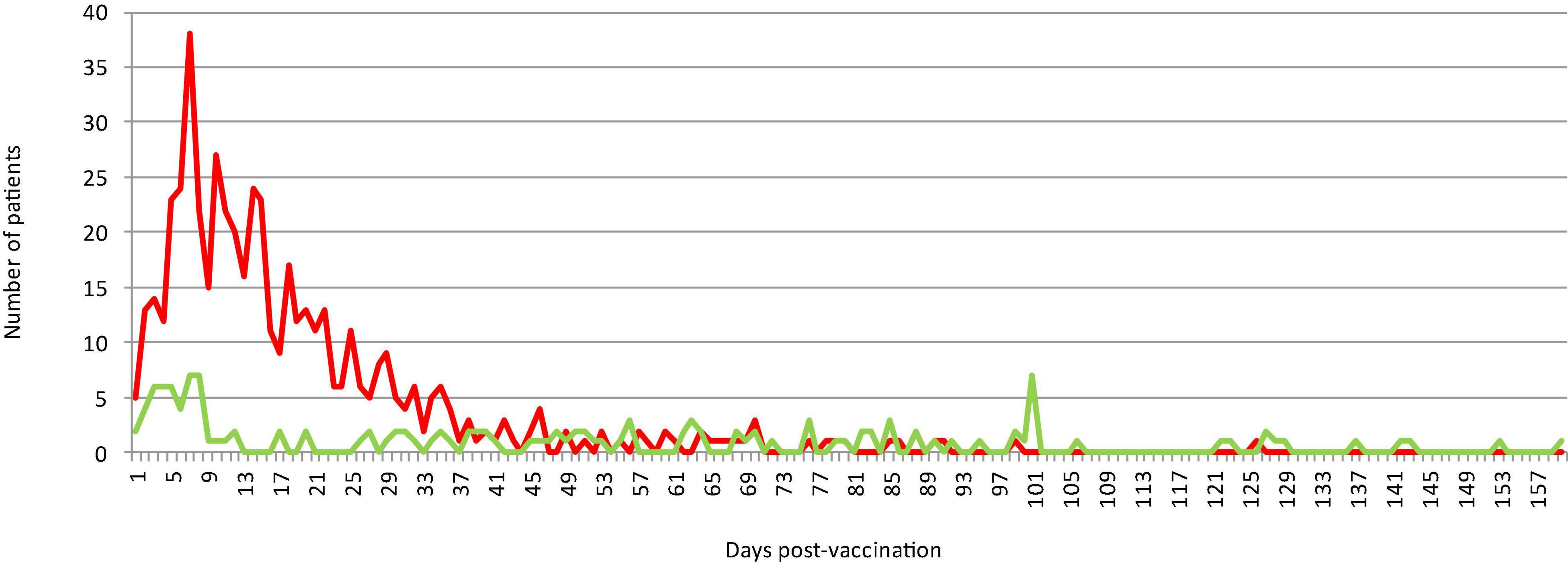 FIGURE 1. Temporal distribution of the numbers of patients who experienced SARS-CoV-2 infection following vaccination, according to the delay between vaccination and infection diagnosis. The red and green curves indicate patients who received a first or second dose, respectively.