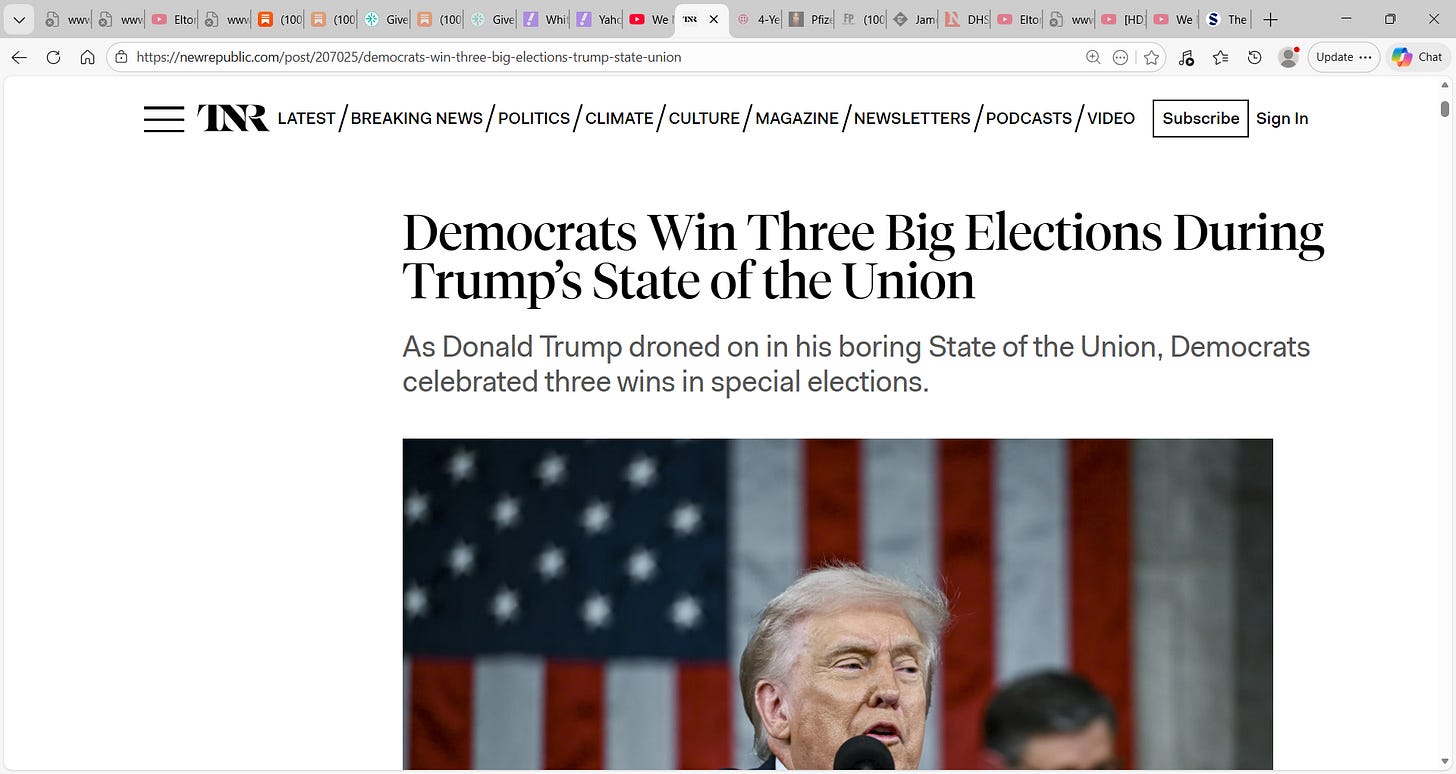 Again, as the State of the Union speech took place, Democrats notched 3 more special elections wins...no doubt the reporting may be biased but the results are real "Democrats Win Three Big Elections