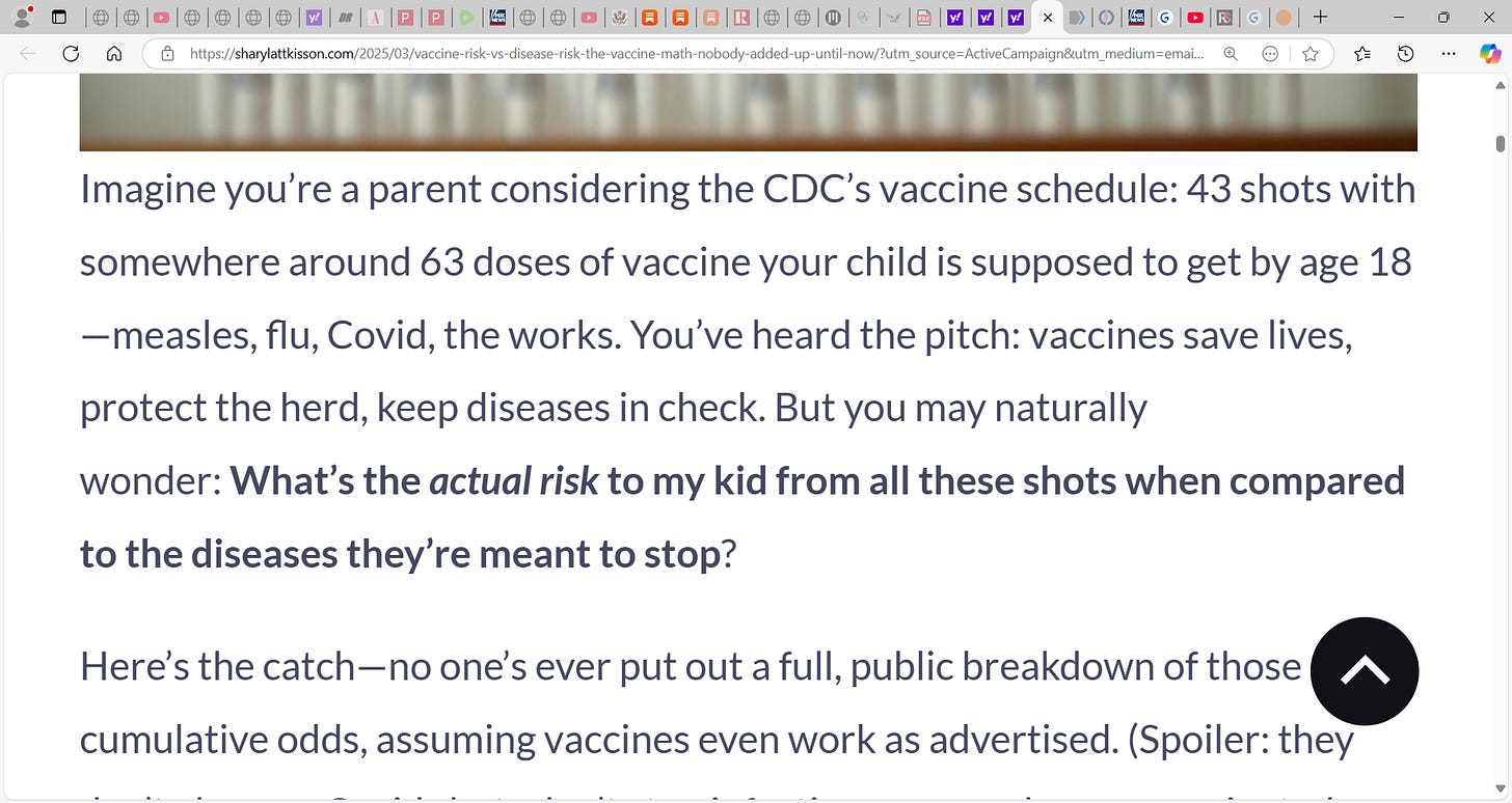 Here’s the catch—no one’s ever put out a full, public breakdown of those cumulative odds, assuming vaccines even work as advertised. (Spoiler: they don’t always—Covid shots don’t stop infection or spread, some vaccinated people still catch measles, mumps, and flu today, and all of the last cases of polio in the US were caused by the vaccine.)