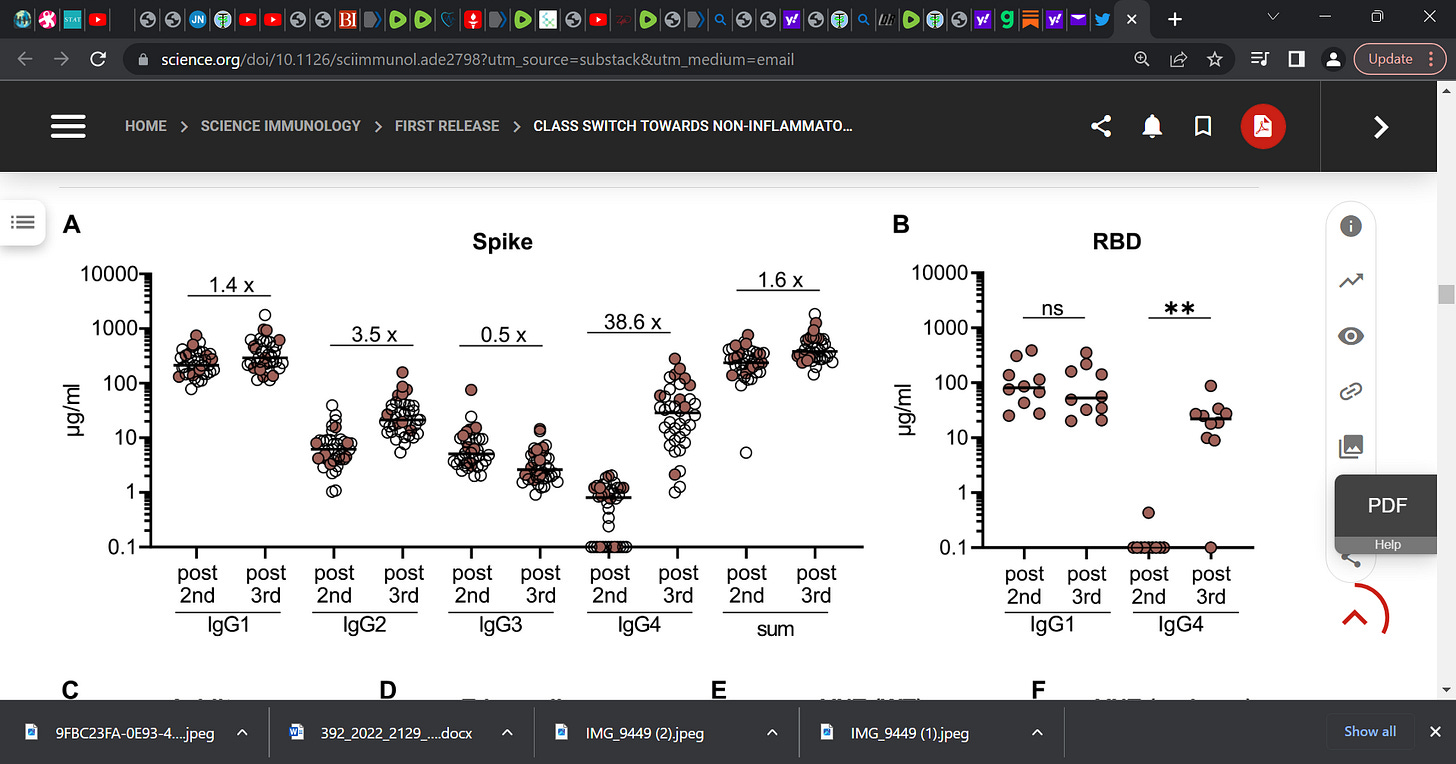 So not sure yet if this is entirely alarming, in my capacity. Is this a good thing or a bad thing, in terms of class switching to IgG4 antibodies? We need experts to weigh in on this for IMO the researchers did not properly interpret their own research findings. So not sure if we are to worry about this but the issue of tolerance is important if this is unfolding and this is shown definitively and stably. In fact, it is devastating. In short, the immune system is being told to stand down based on the surge of IgG 4 antibodies. Do not attack. We are thus open to all things with these gene injections that have proven to be deadly and we are seeing it constantly in the published data.