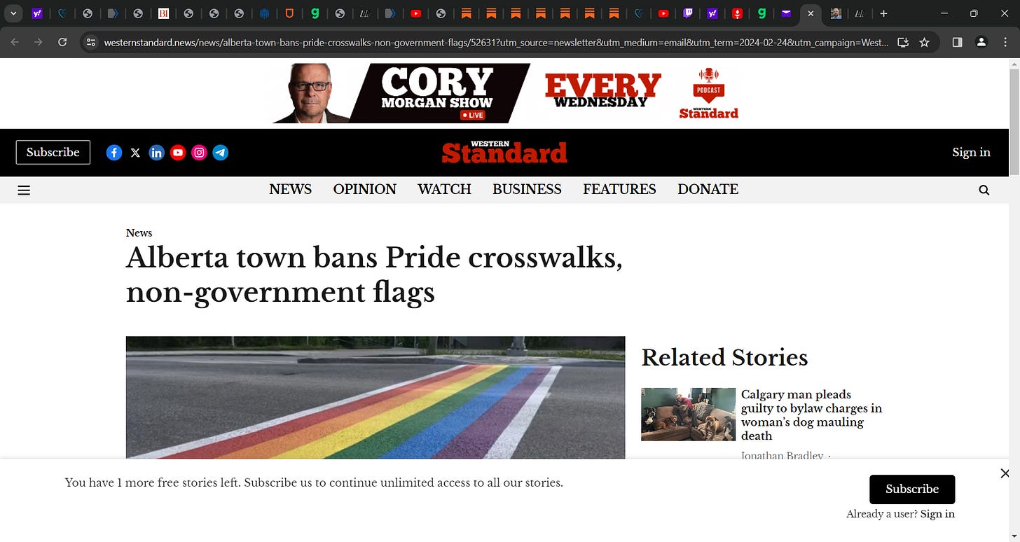 https://www.westernstandard.news/news/alberta-town-bans-pride-crosswalks-non-government-flags/52631?utm_source=newsletter&utm_medium=email&utm_term=2024-02-24&utm_campaign=Western+Standard+s+Daily+Newsletter