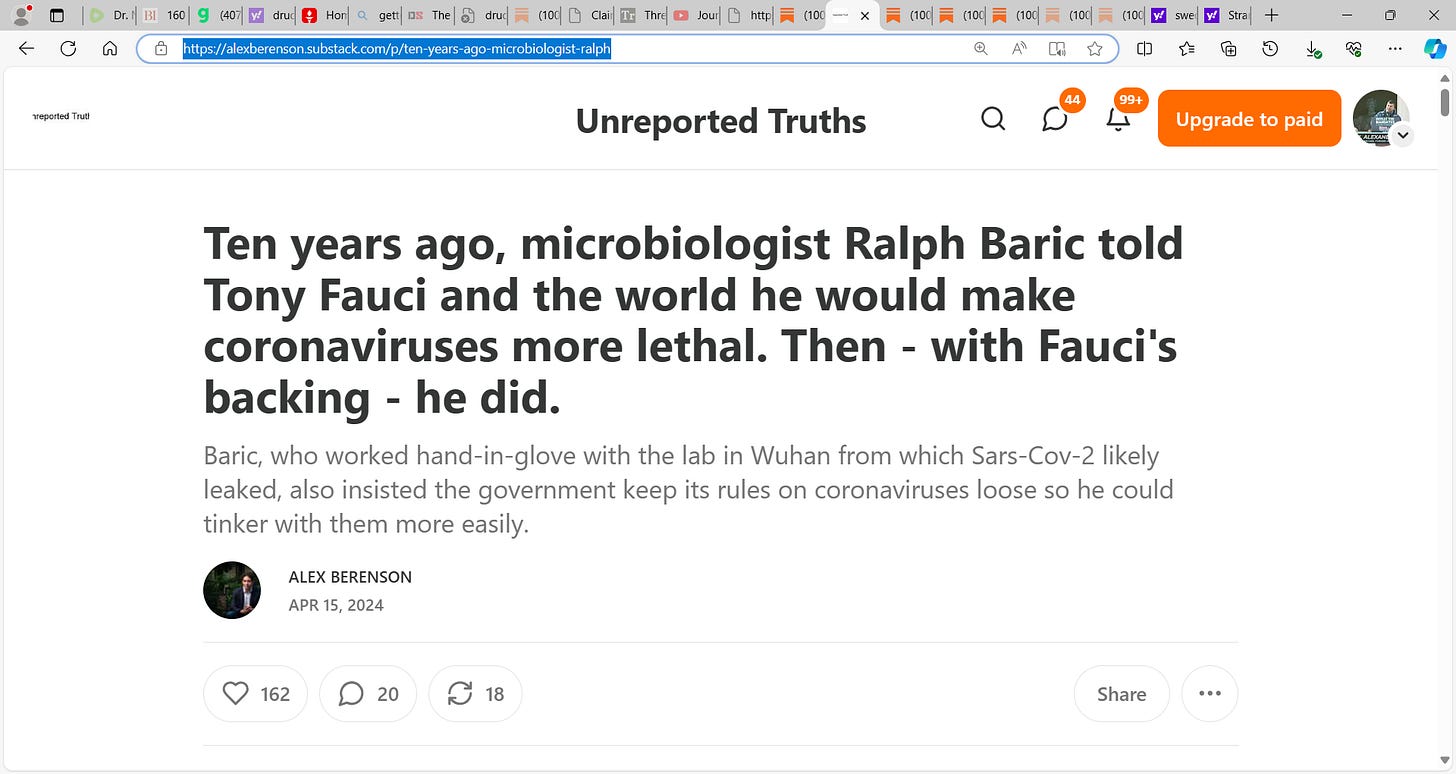 Alex Berenson's recent substack is a decent attempt to summarize Baric's & Fauci's close affiliation & how Fauci perjured himself under oath! But his contention that this COVID SARS-CoV-2 WAS a