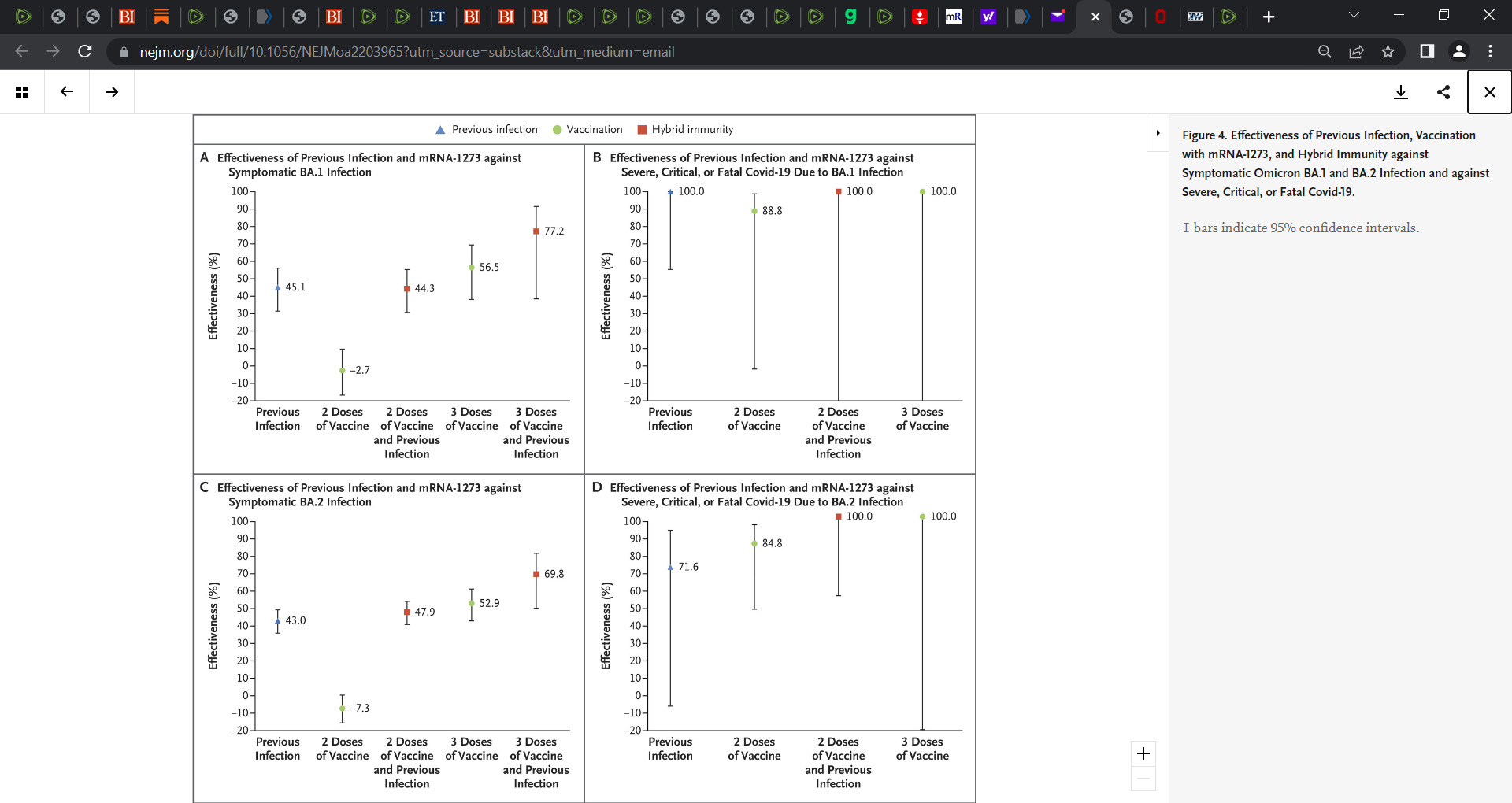 “Conducted a national, matched, test-negative, case–control study in Qatar from December 23, 2021, through February 21, 2022, to evaluate the effectiveness of vaccination with BNT162b2 (Pfizer–BioNTech) or mRNA-1273 (Moderna), natural immunity due to previous infection with variants other than omicron, and hybrid immunity (previous infection and vaccination) against symptomatic omicron infection and against severe, critical, or fatal coronavirus disease 2019 (Covid-19).”