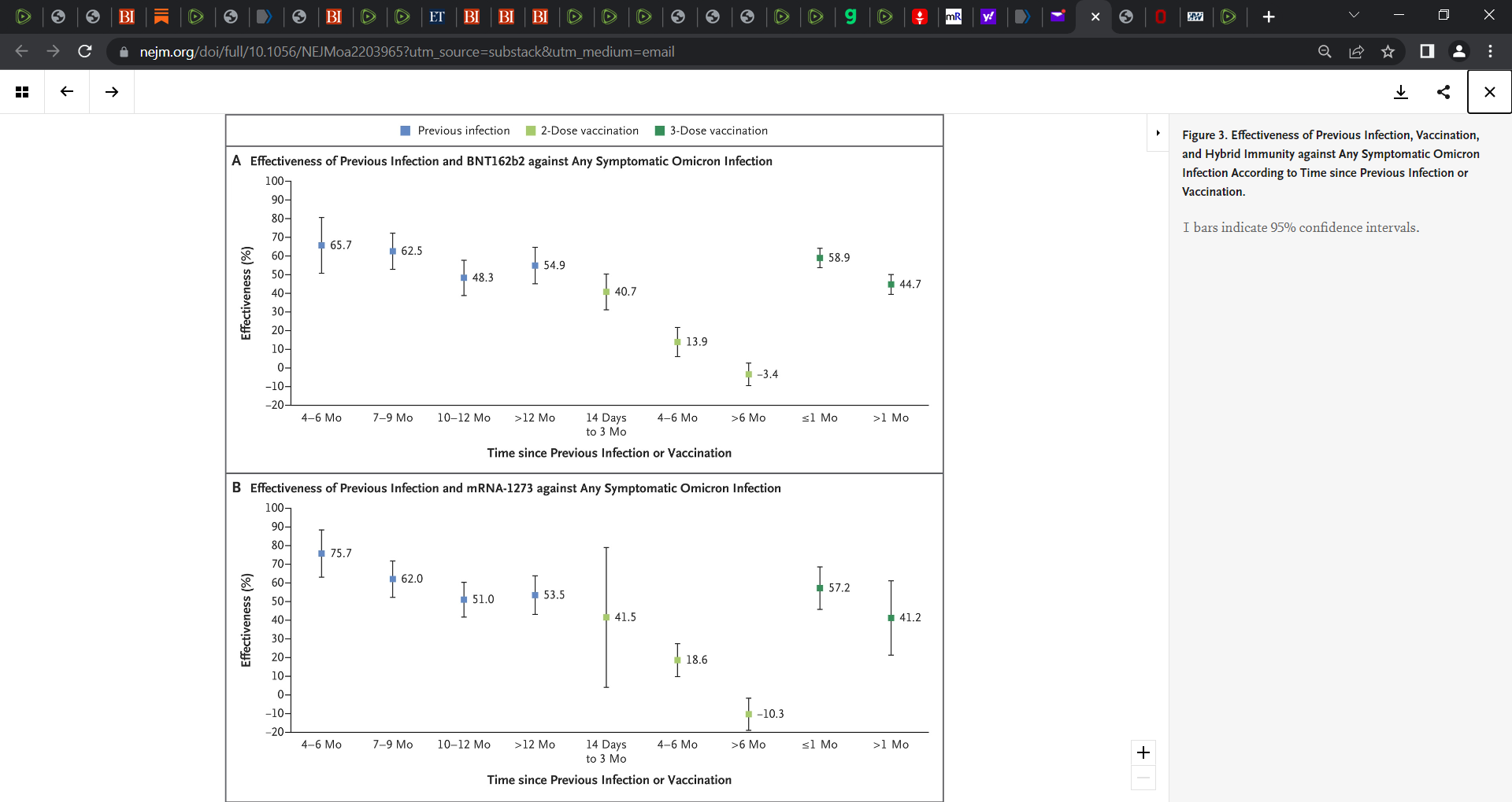 “The analysis of the effectiveness of previous infection, two-dose vaccination, and three-dose vaccination as a function of time since the immunologic event (previous infection or vaccination) showed rapidly waning vaccine protection after the second and third doses but slowly waning protection from previous infection (Figure 3).”