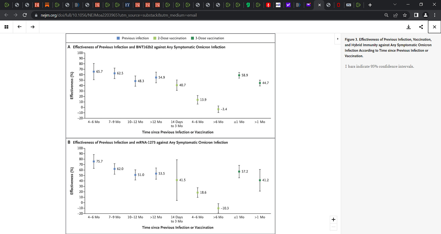 Now, we see in figure 3 that the mRNA vaccines are (both Pfizer and Moderna) out performed by natural exposure immunity in terms of offering protection. A key to me is that the natural exposure immunity declines much slower than vaccinal immunity and the data shows this clearly.