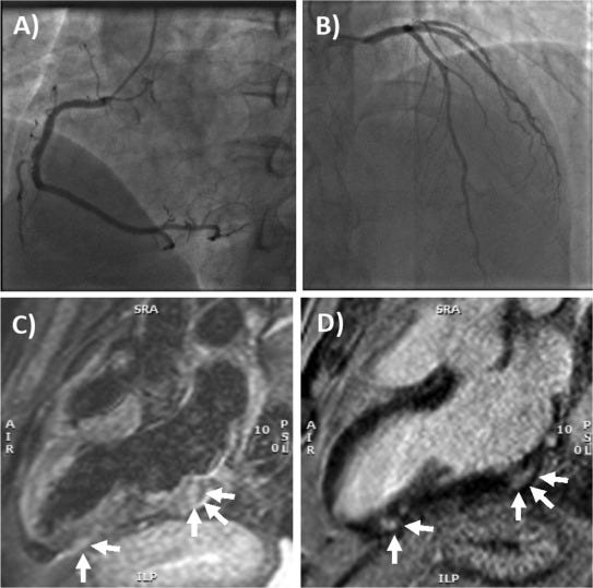 ‘Fig. 1. Coronary angiography and cardiac MRI. (A) The right coronary artery only had a mild plaque (<30% luminal diameter) in the mid portion, while (B) left main stem, left anterior descending artery and circumflex artery had no evidence of coronary plaques. (C) T2- weighted 3-chamber view on cardiac MRI, showing focal areas of edema involving the subepicardial-intramyocardial regions of the basal and apical segments of the infero-lateral wall (arrows). (D) Late gadolinium enhancement confirmed the presence of non-ischemic myocardial lesions in the basal and apical segments of the infero-lateral wall (arrows) consistent with acute myocarditis.’