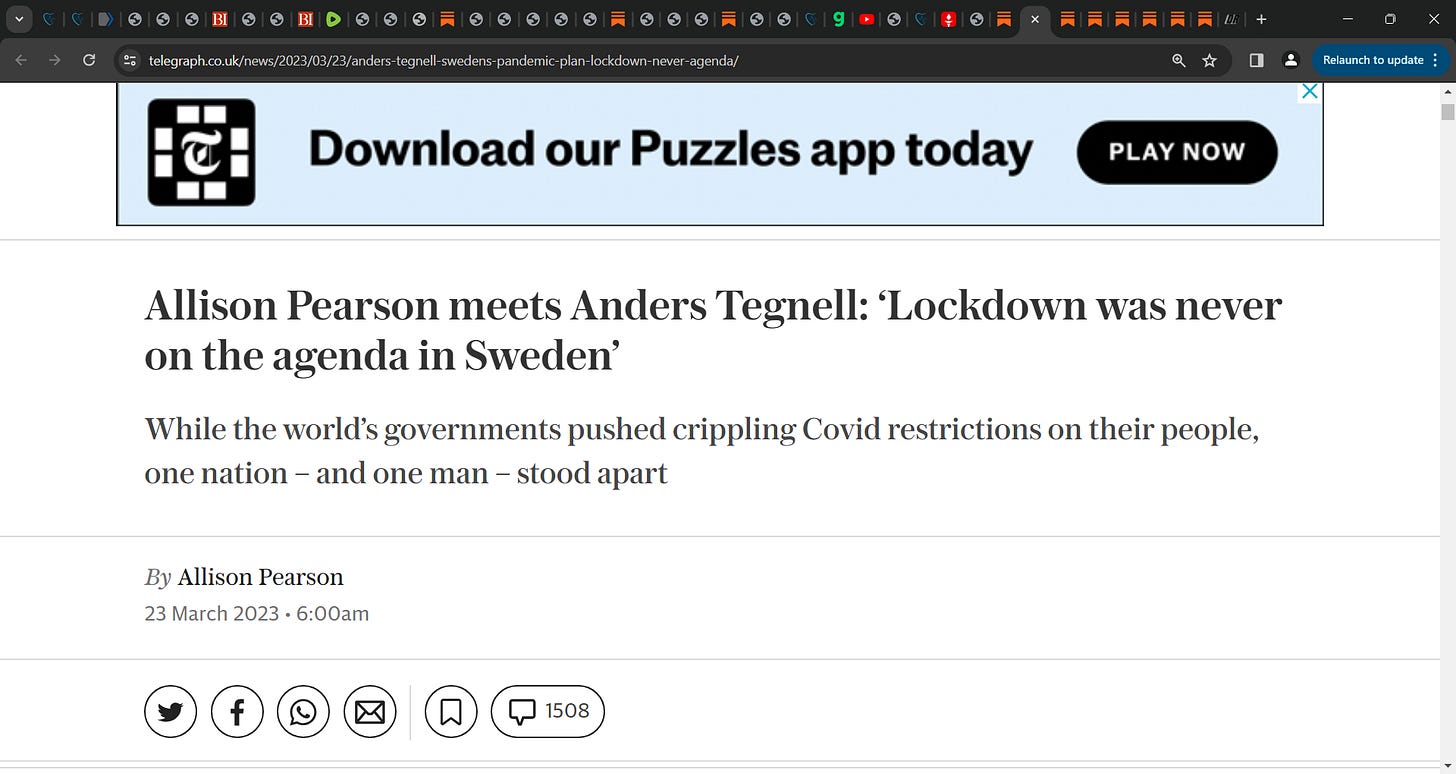 ‘In March 2020, as, one by one, every country in the Western world succumbed to panic and imposed a lockdown on its population, Sweden’s state epidemiologist held his nerve and stuck to the plan. The Swedish people would be given sensible advice and told to work from home wherever possible, but apart from a ban on gatherings of over 50 people and a few rules for restaurants, any Covid measures were entirely voluntary. Anders Tegnell simply didn’t think the evidence supported a lockdown. A veteran of the swine flu pandemic who had worked with the deadly Ebola virus, the 63-year-old doctor wasn’t going to do something unproven or plain stupid because a lot of over-heated people were yelling at him to do it.