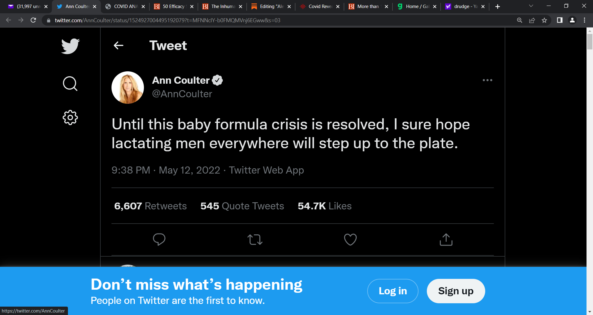 Ann Coulter calls on lactating men to step up to alleviate the baby food shortage; I agree with her for between the males who wear tampons and the lactating ones, we 'got this'...