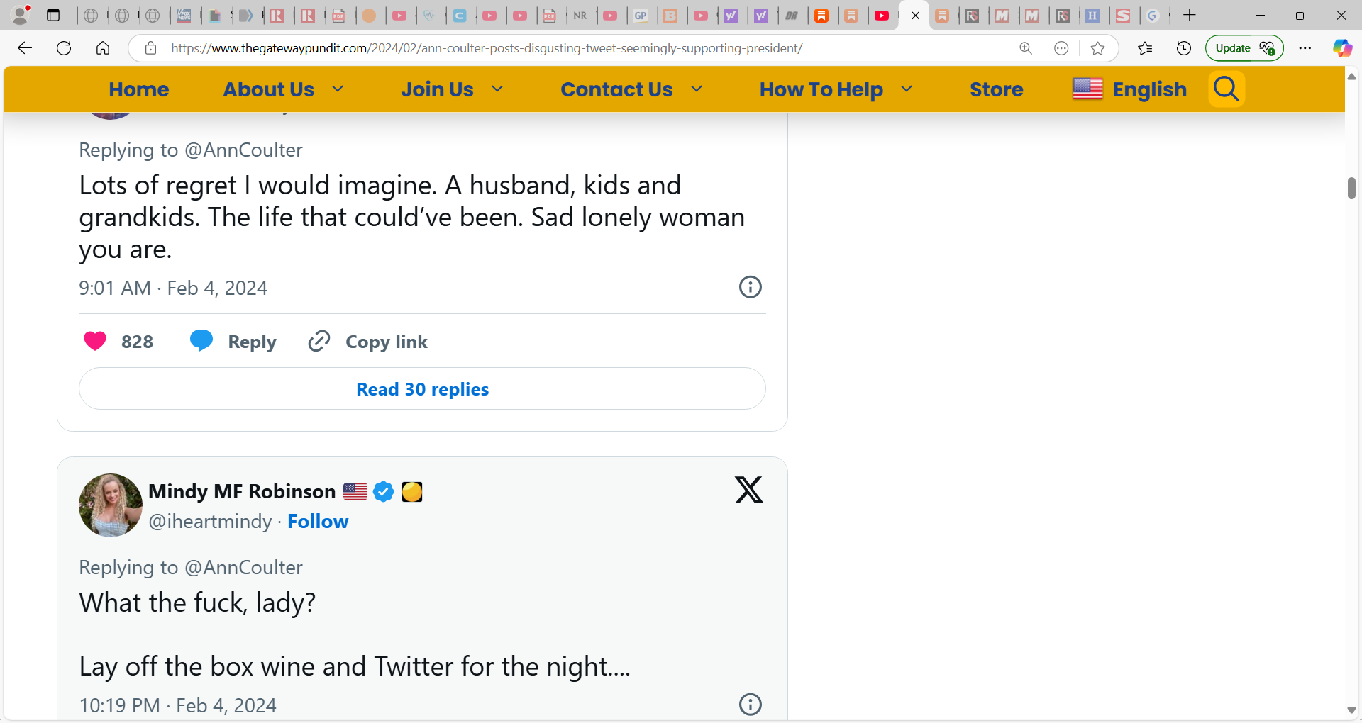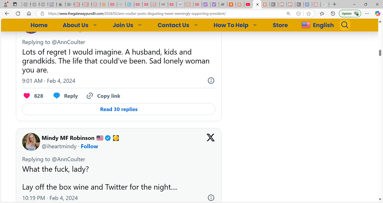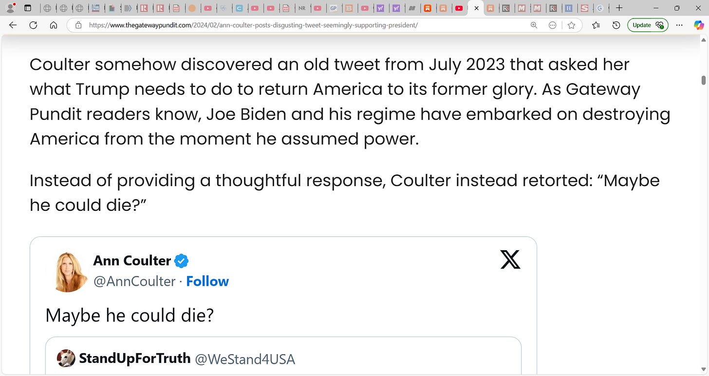 Ann Coulter has been anti-Trump is a bad way and it’s one thing to disagree, but her invectives were rough…I do not trust her. She said she hoped he would die etc. not good. I detested Biden et al. policies and others but cannot see myself wishing and discussing people dying on account of my dislike or disdain…no, we must be able to disagree etc. but civilly too.