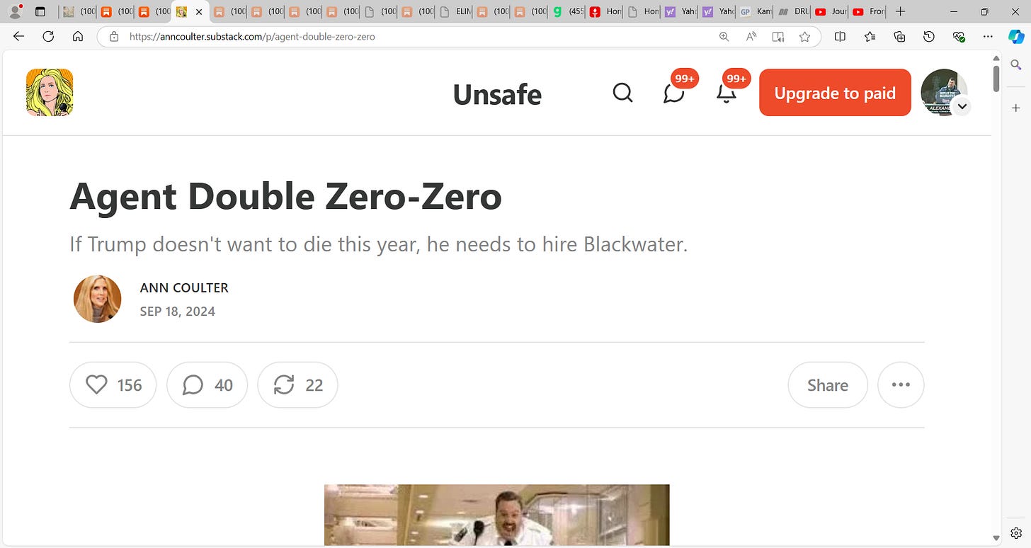 Ann Coulter's new substack is on point, MOABs on the keystone mall cop incompetent law enforcement e.g. Secret Service (SS) etc. "If Trump doesn't want to die this year, he needs to hire Blackwater."