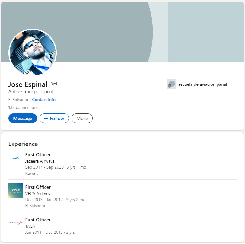 José Miguel Espinal was a Salvadoran pilot who forged a career in airlines inside and outside his country of origin. As a review The world, was known through his LinkedIn profile who was an aviator known for his work on local airlines Taca and Veca, as well as Kuwait-based international airline Jazeera Airways.