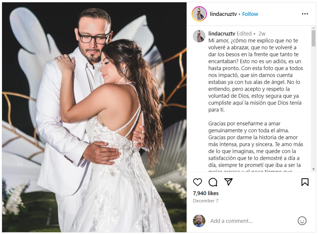 A heartbreaking and unexpected message from the sports representative Linda Cruz moved social networks. The Salvadoran communicator announced with great regret that she is saying goodbye to her husband, José Miguel Espinal, who died just 18 days after going to the altar with her (married on Nov.18, 2023).