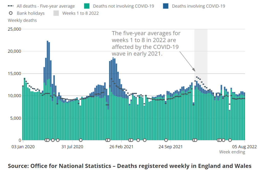 SOURCE ‘The high number of U.K. excess deaths since April has finally made it into the mainstream media, courtesy of the Telegraph and Professor Carl Heneghan. According to the ONS, as of August 5th 2022 there have been 13,398 excess non-Covid deaths registered in England and Wales since April 23rd. The Telegraph reports that the Government is now looking into what is behind this alarming wave of unexplained deaths, which is about time, having previously said it would not. Does it only matter when the Telegraph says it?