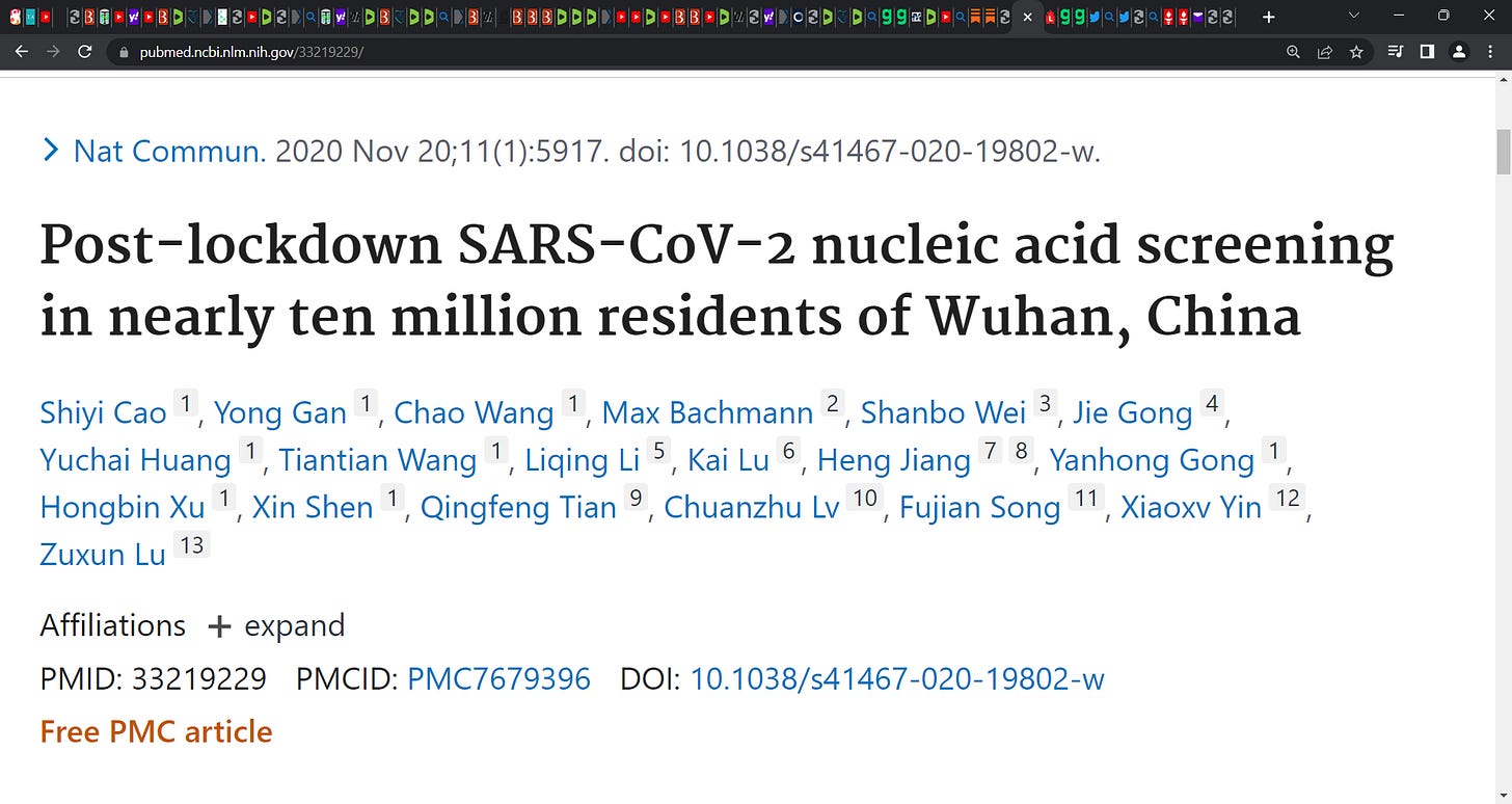 ‘Stringent COVID-19 control measures were imposed in Wuhan between January 23 and April 8, 2020. Estimates of the prevalence of infection following the release of restrictions could inform post-lockdown pandemic management. Here, we describe a city-wide SARS-CoV-2 nucleic acid screening programme between May 14 and June 1, 2020 in Wuhan. All city residents aged six years or older were eligible and 9,899,828 (92.9%) participated. No new symptomatic cases and 300 asymptomatic cases (detection rate 0.303/10,000, 95% CI 0.270-0.339/10,000) were identified. There were no positive tests amongst 1,174 close contacts of asymptomatic cases. 107 of 34,424 previously recovered COVID-19 patients tested positive again (re-positive rate 0.31%, 95% CI 0.423-0.574%). The prevalence of SARS-CoV-2 infection in Wuhan was therefore very low five to eight weeks after the end of lockdown.’