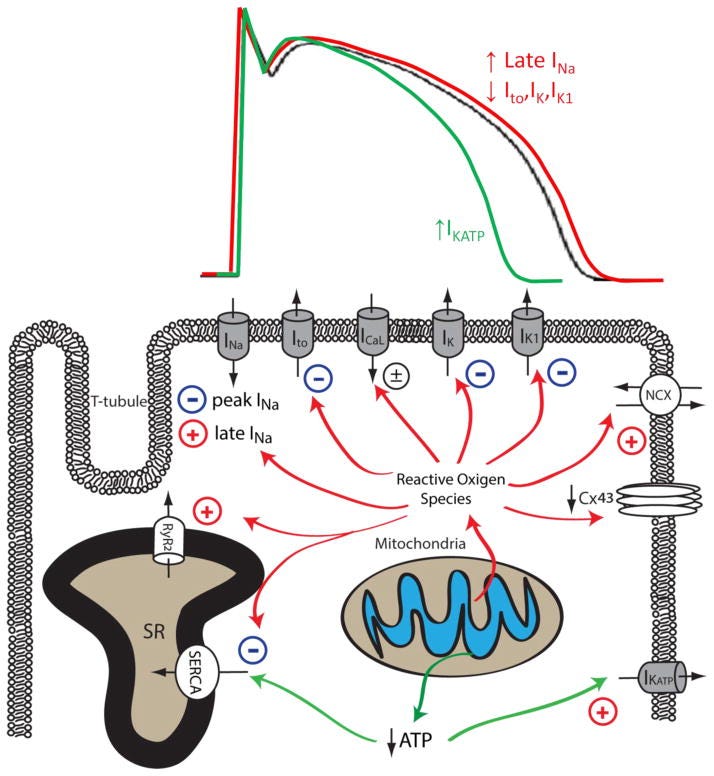 In summary, mitochondrial dysfunction is prevalent in arrhythmogenic cardiac diseases including cardiac hypertrophy, heart failure and myocardial ischemia. Reduced ATP synthesis and increased ROS production associated with mitochondrial dysfunction can lead to malfunction of various cellular mechanisms that are required to maintain normal electrical functioning and intracellular ionic homeostasis in cardiomyocytes. As summarized in Figure 2 (above) and Table 1, mitochondrial dysfunction can lead to reduced peak INa and downregulation of Cx43, resulting in abnormal conduction and increased propensity for re-entrant type cardiac arrhythmias. Increased cellular ROS also increases late INa and reduces repolarizing Kv currents, leading to impaired repolarization, prolonged APD, EADs, increased electrical heterogeneity in the myocardium, and increased arrhythmia susceptibility. Mitochondrial dysfunction also leads to disrupted intracellular Ca2+ homeostasis in cardiomyocytes, resulting in cytosolic Ca2+ overload and proarrhythmic DADs. Finally, mitochondrial dysfunction also causes the depolarization of ΔΨm and the opening of sarcoKATP channels, creating a current sink for the propagating depolarization wave, potentiating conduction block and arrhythmia.