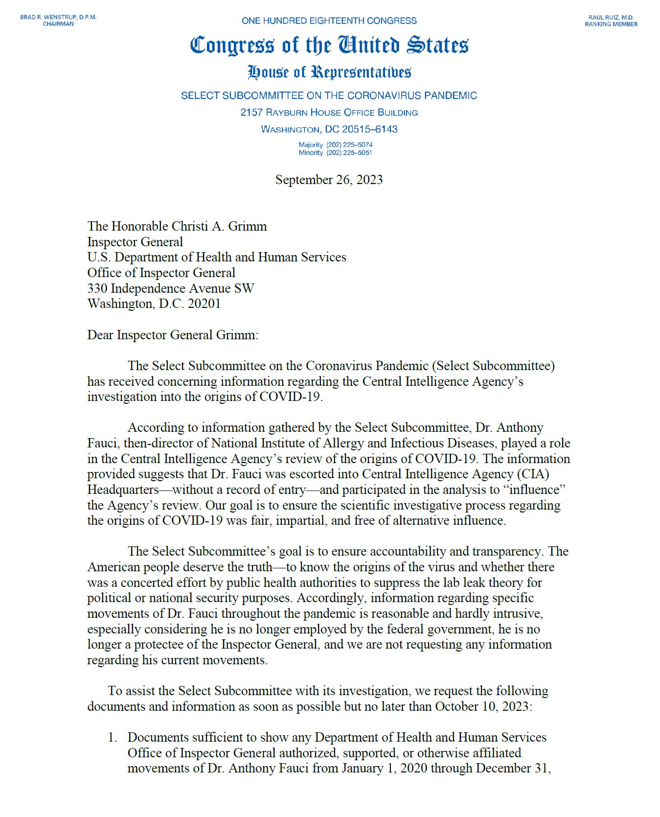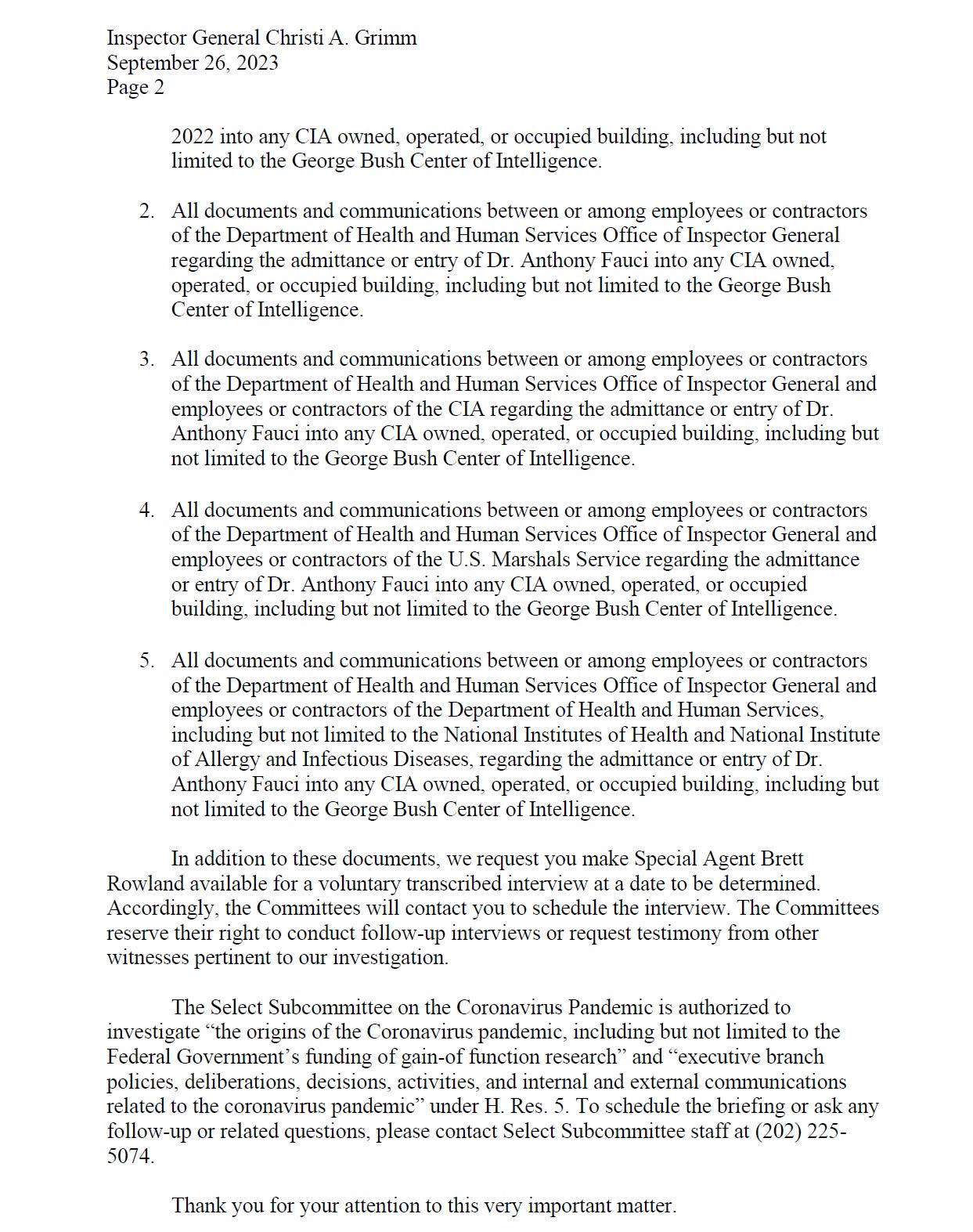 According to information gathered by the Select Subcommittee, Dr. Anthony Fauci, then-director of National Institute of Allergy and Infectious Diseases, played a role in the Central Intelligence Agency’s review of the origins of COVID-19. The information provided suggests that Dr. Fauci was escorted into Central Intelligence Agency (CIA) Headquarters—without a record of entry—and participated in the analysis to “influence” the Agency’s review.