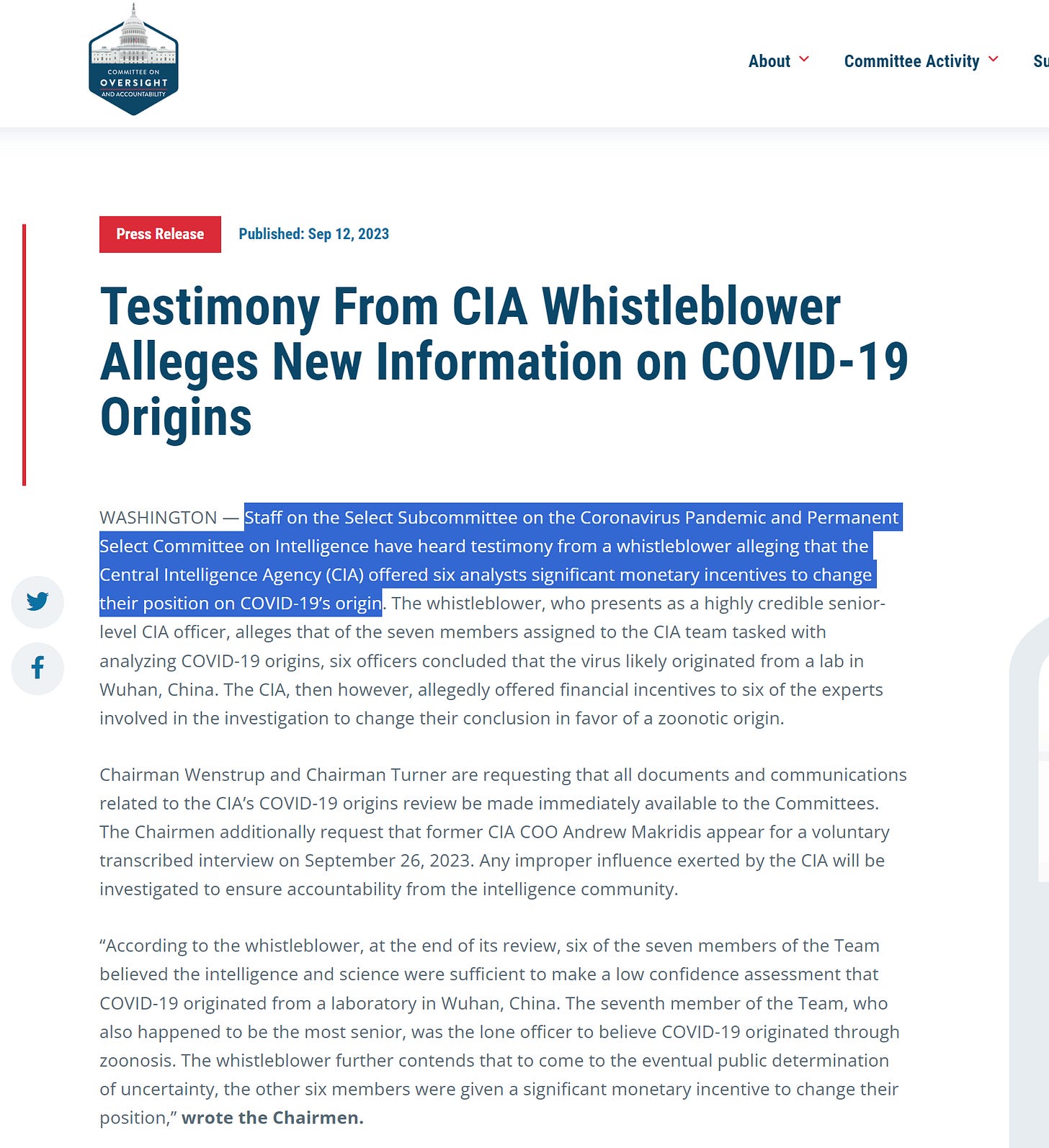 as many of you likely saw, a whistleblower came forward to discuss the fact that a number of CIA analysts appear to have been paid to change their takes on covid origins.
