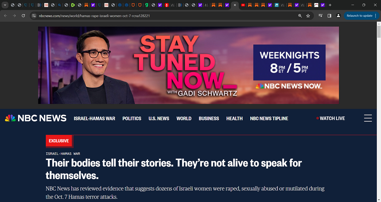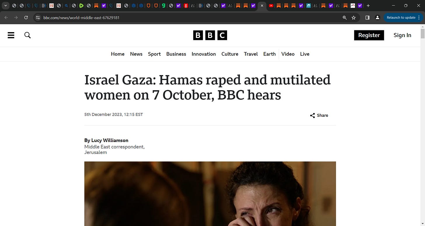 Berenson has followed my substack articles asking where are women groups, Me Too? feminists speaking out for Israeli women? saw video where HAMAS inserted metal rods into vaginas exiting their mouths