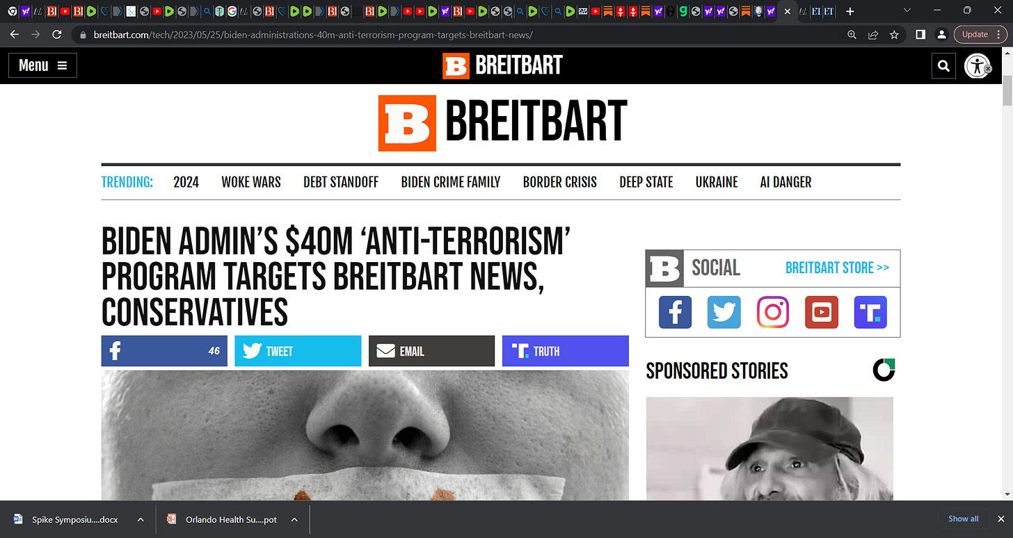 'Biden Admin’s $40m ‘Anti-Terrorism’ Program Targets Breitbart News, Conservatives'; Documents uncovered by the Media Research Center (MRC) revealed the Biden Administration used a $40 million grant