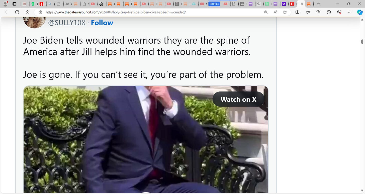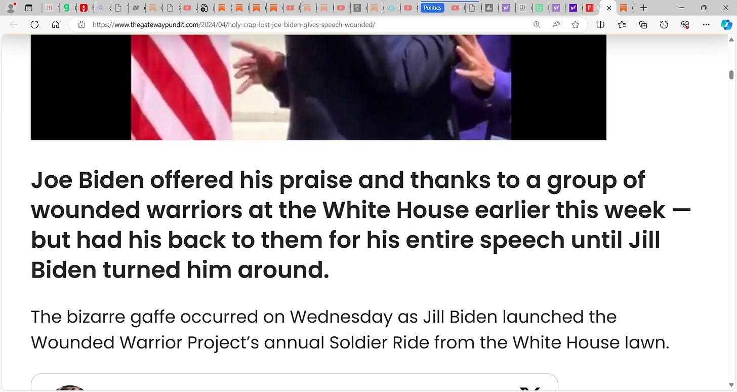 Biden is GONE, senile, how can you keep going with this? FLOTUS Jill Biden had to turn him around to face wounded warriors he was talking too...again, he talks to the air...confused walked to opposite