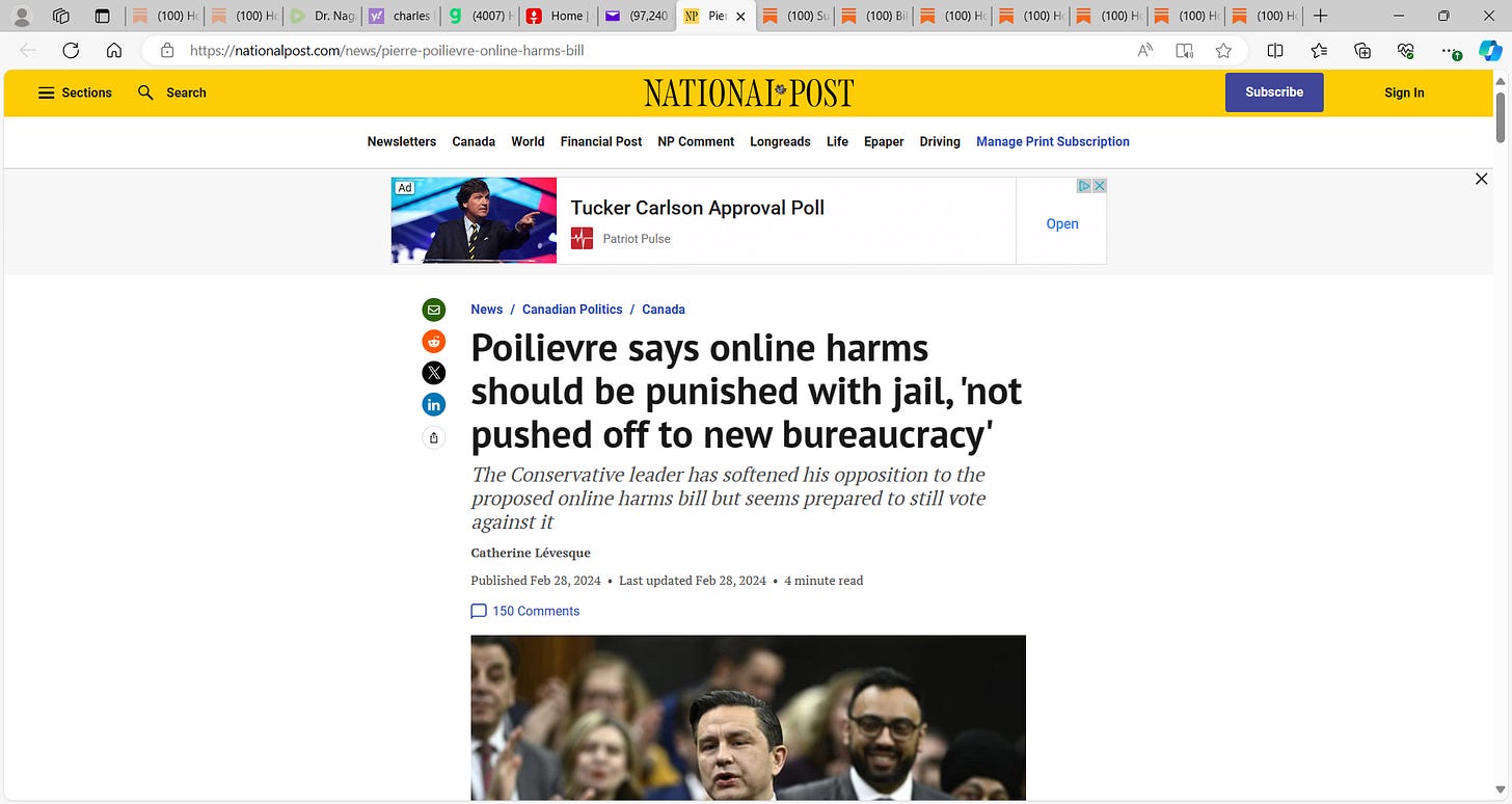 Poilievre seems like he will vote against it, however, he says online harms ‘should’ be punished with jail and not pushed off to a new bureaucracy. So, is he for jailing and his only issue is it’s under a new bureaucracy?