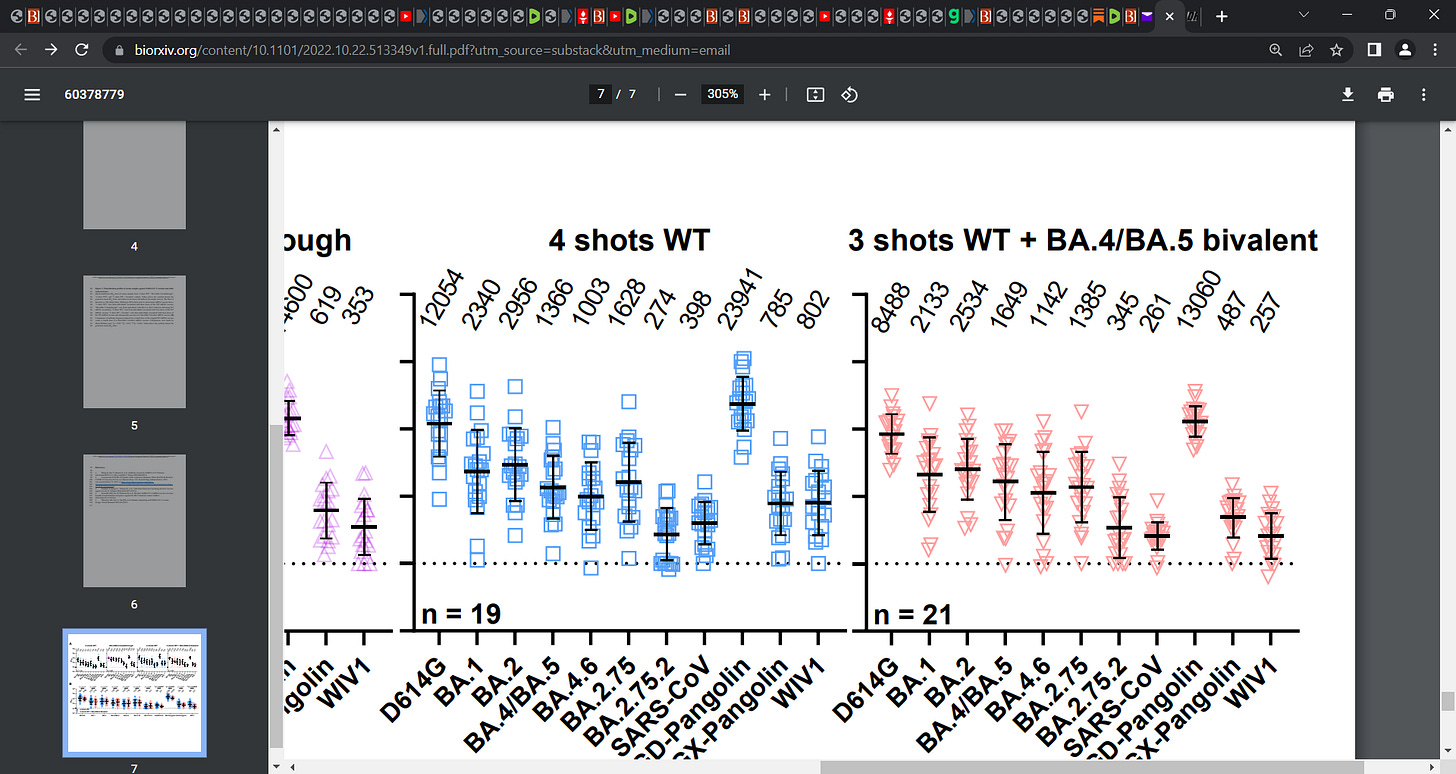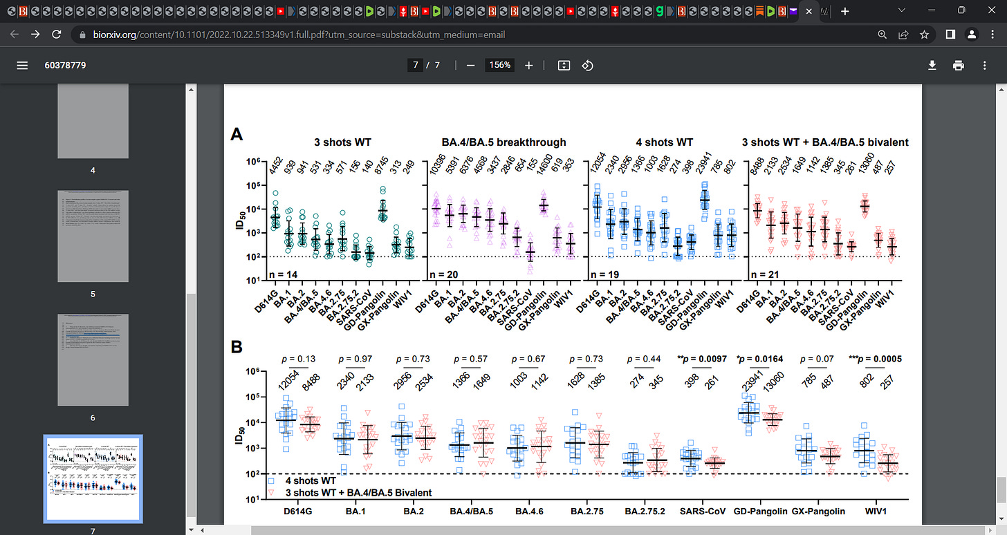 “Those who received a fourth monovalent vaccine (2 initial doses plus 2 boosters) dose had a slightly higher neutralizing antibody titers than those who received the bivalent vaccine against three related sarbecoviruses: SARS-CoV, GD-Pangolin, and WIV1.” (see top graphs, row A, the extreme right 2 graphs, 4 shots vs 3 shots plus bivalent booster)