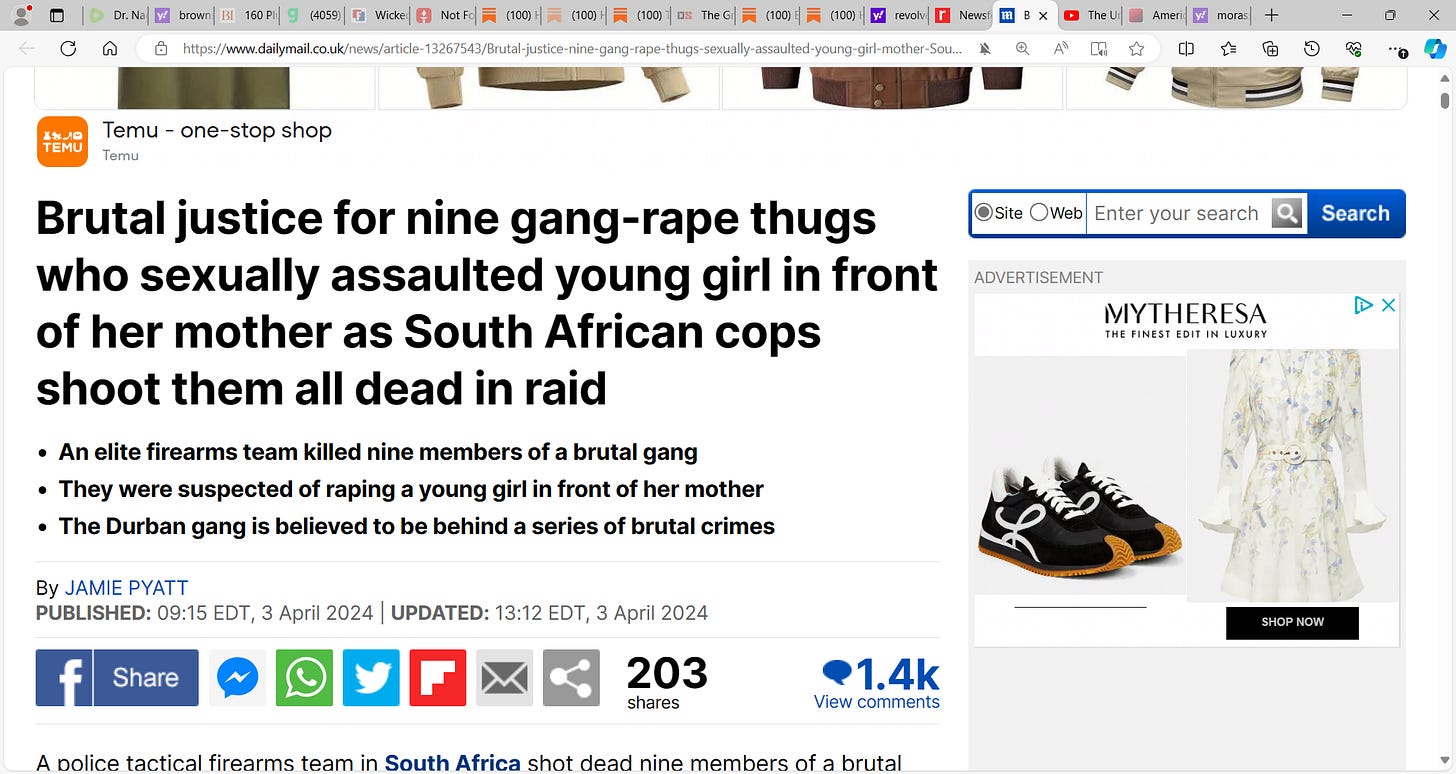 BOOM! 'A police tactical firearms team in South Africa shot dead nine members of a brutal gang suspected of raping a young girl in front of her screaming mother.' Now this is beautiful!! I love it!